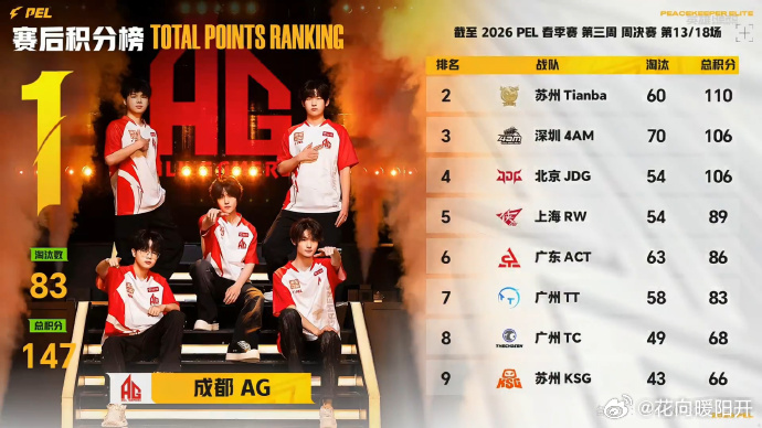 PEL春季赛第三周冠军之夜 赛场之上变数不断,但成都AG和平精英的竞技状态一直在线😤,第三周周决赛第二日拿下三鸡领跑积分榜🥇,队员个人数据也格外亮眼!