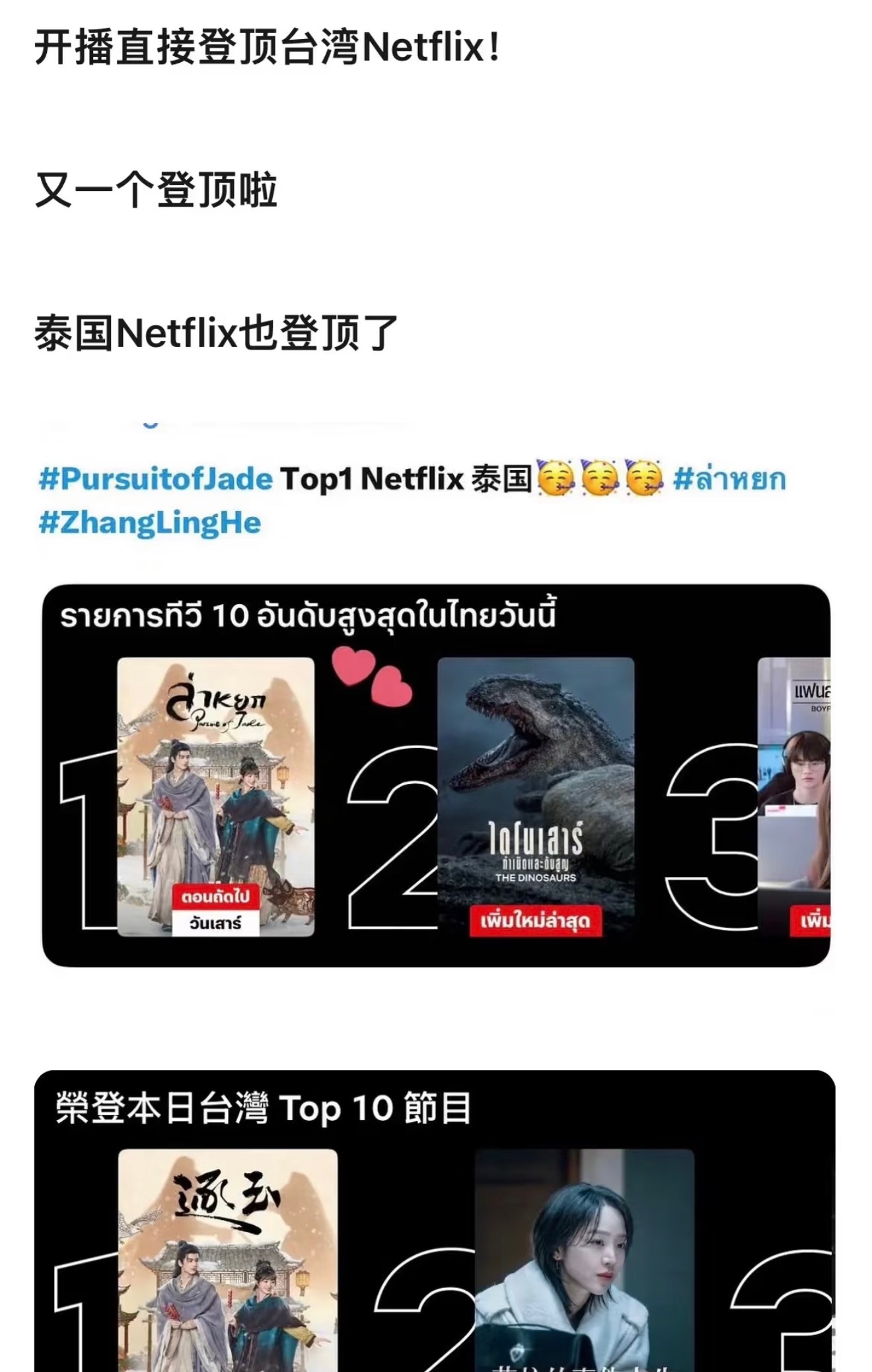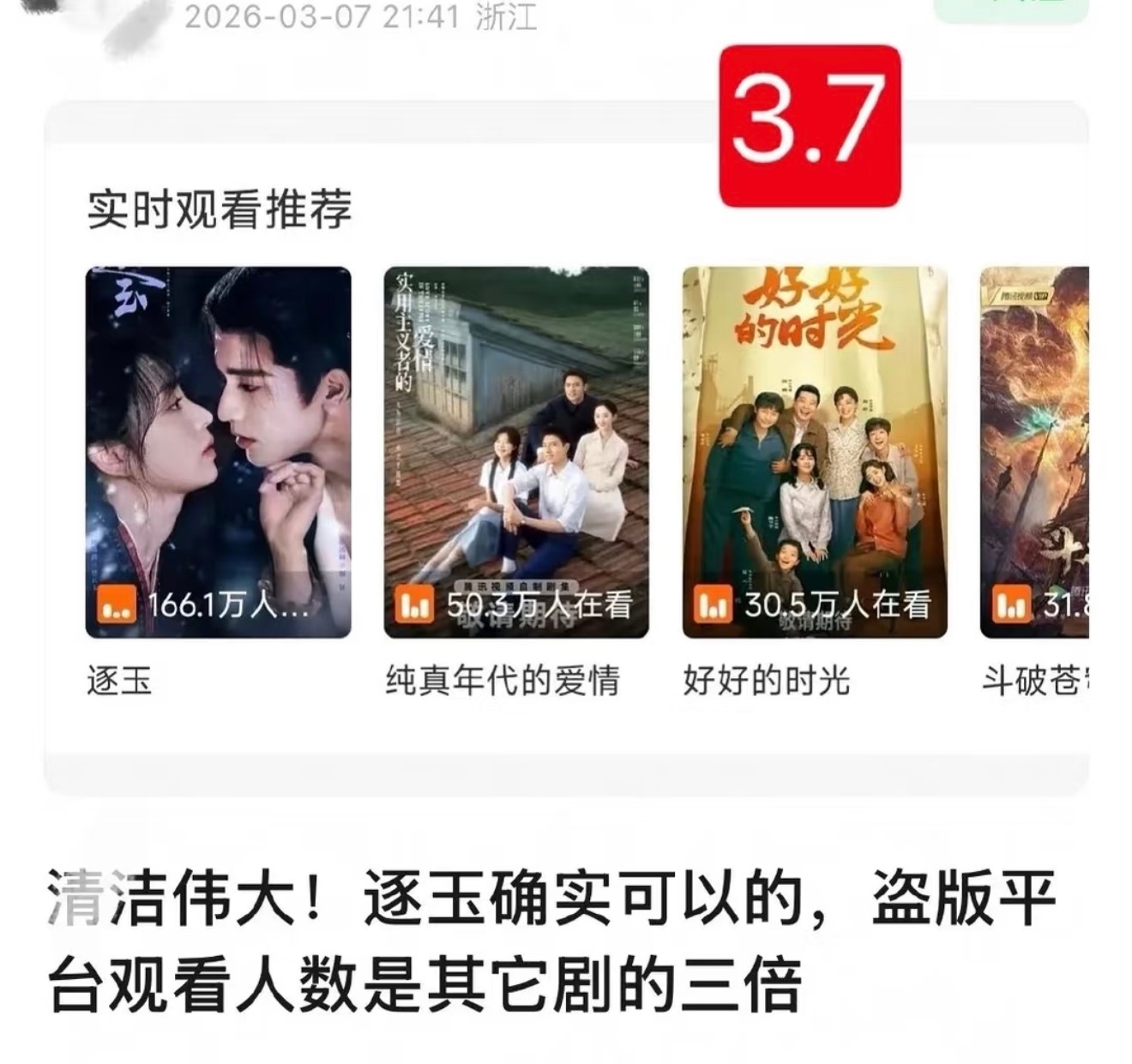 逐玉 出圈梗长剧颓了那么久,没想到靠张凌赫给带起来了,真吸干大盘了。在首日爆开的情况下次日还能翻倍占率高达31.4%,为2026年首部热播榜市占率破30%的剧集。海外和香港都已经登顶了,海外买通了,盗版买通了,连原著小说都买通了,反正逐玉统治了全世界。