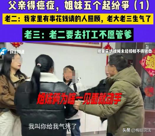 河南周口,老人独自拉扯五个女儿长大,还用尽全力帮她们成了家,可年老后他得了癌症,五个女儿因赡养他的问题反目成仇。老四老五至始至终不参与照顾父亲的轮换,老大和老二大打出手,老三帮腔老大,可老二也憋屈地说:我又没说不赡养,我愿意出钱啊。老人躺在床上掉眼泪,垂着床板直叹气。 这个家庭,母亲早早离世,老父亲独自一人扛着生活的重担,含辛茹苦将五个女儿拉扯长大。他靠着一身力气打工挣钱,省吃俭用供女儿们读书,又费尽心力帮她们操办婚事。 老父亲一辈子的心血都倾注在了五个女儿身上,只盼着老了能享几天清福,可天不遂人愿,幸福的日子没过几天,老人就得了癌症,及时动了手术也没啥效果,很快蔓延全身,生活不能自理。 老父亲如今重病缠身,于情于理,五个姐妹都该共同扛起赡养照料的责任。 单靠一个人也不现实,毕竟五个女儿都各自成家,有自己的小家庭要打理,如果把照料老人的重担全压在一个人身上,日复一日的贴身伺候,任谁的身体和精力都扛不住,只有姐妹几人轮流分担,才能让老人得到周全的照顾。 在农村的传统观念里,家中老大向来要带头担责,老大也确实做到了尽心尽力,老人刚被查出癌症那会,全程都是老大冲在最前面。从跑前跑后办理住院,到医院的陪护,全都压在老大一个人肩上,她没有半句抱怨。 直到手术完成,老大实在分身乏术,才跟几个妹妹开口,商量着轮流回家照顾父亲的事。 老大先把老人接到自己家伺候了几个月,后来老大给老二打电话,让老二照顾,女婿却不同意接回自己家,老大虽然生气但是也妥协了,对老二说:你可以来我家照顾。 老二确实来到老大家照顾了,可是老人本就不能自理,晚上又疼痛难忍,老二受不了打扰,父女俩经常吵架,老大看不下去老二的态度,就气愤地说:你才照顾几天就受不了了,就和父亲吵架?你滚! 老二真听话,真滚了,再也不来老大家里探望。 老大很委屈,老人得病后烦躁,就是自己伺候老人时,老人有时也会破口大骂,甚至会动手,但是毕竟是自己的父亲啊,不还得细心伺候吗。 老三倒是经常来看望老人,自然知道大姐的苦楚,就怒斥老二毫无良心,当时父亲打工的钱贴补老二不少。 老二气不打一处来,说父亲给老大帮忙看孩子十几年,他不伺候谁伺候?再说看病没出钱吗,找护工我也愿意出钱。 老三替老大说话:老二净说瞎话,一共看了一年孩子,问题是大姐一直在照顾啊。之前小病小灾从不麻烦几个妹妹,现在实在没办法了,不轮换怎么办?护工能有自己人看的负责任吗?关键是根本没有这个孝心。 说到气愤处,老大和老二动起手来,相互指责,女婿们见状也加入混战。 房间里的老父亲听到外面的女儿争吵,伤心的暗自流泪,哆嗦地说,她们变成这样,是怨我还是怨她们啊,唉,唉… 老二最后自己也觉得理亏,拍着胸脯说今天就把老父亲接回家,不让其他几个姐妹管,直到老人咽气。 结局看似很美好,只不过不知道是老二一时赌气说出的话,还是真心话,承诺并不是冲动,是每天24小时的陪伴,端屎端尿,是每天要忍受病痛的呻吟,是每天要忍受坏脾气? 老大比较中肯地说,自己是老大,多付出些本也没啥,当然也想妹妹们帮忙分担,而且父亲也很想念妹妹们。 老五电话不接,信息不回,根本不能指望,老四说的理直气壮:只要有一个人不伺候,我就不管。 现在重担全落在老大老二老三身上。 一个父亲抚养五个女儿长大成人了,现在五个女儿赡养老人却闹了那么大的风波。 《民法典》第26条第2款规定:成年子女对父母负有赡养、扶助和保护的义务。 《刑法》第261条规定:对于年老、年幼、患病或者其他没有独立生活能力的人,负有扶养义务而拒绝扶养,情节恶劣的,处五年以下有期徒刑、拘役或者管制。 五个子女赡养老人,不是想不想的问题,是每个人应尽的义务,如果五人完全不管老人,更会触犯刑法,将会得到严厉的刑罚。