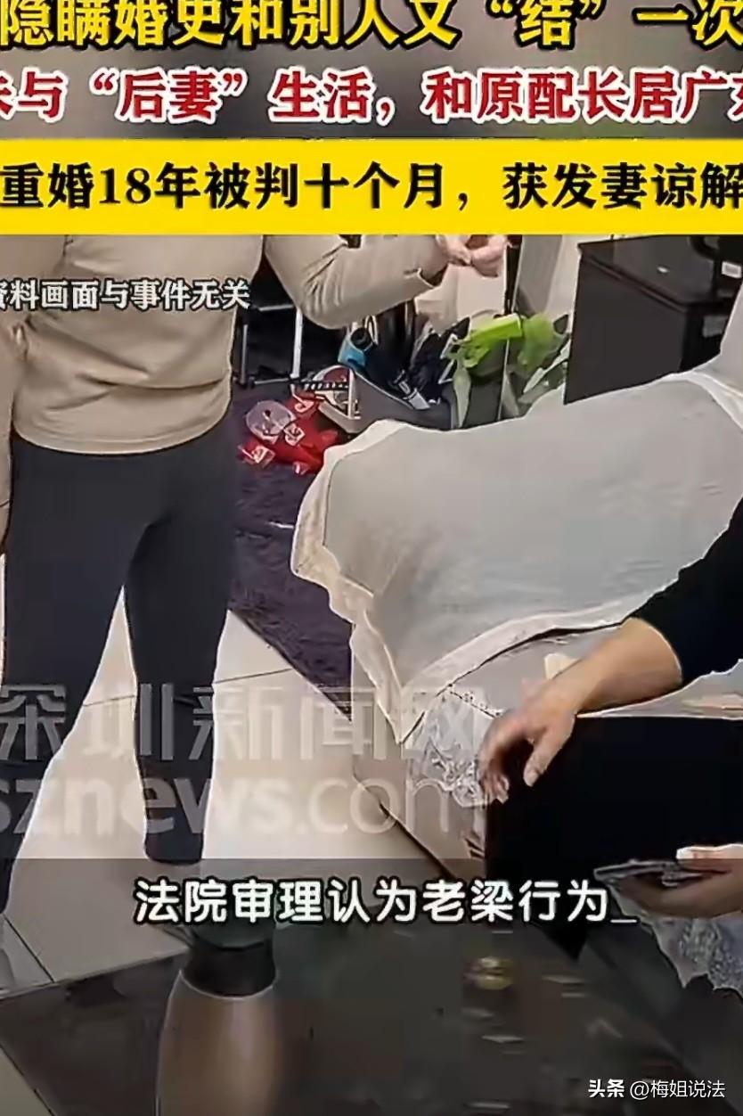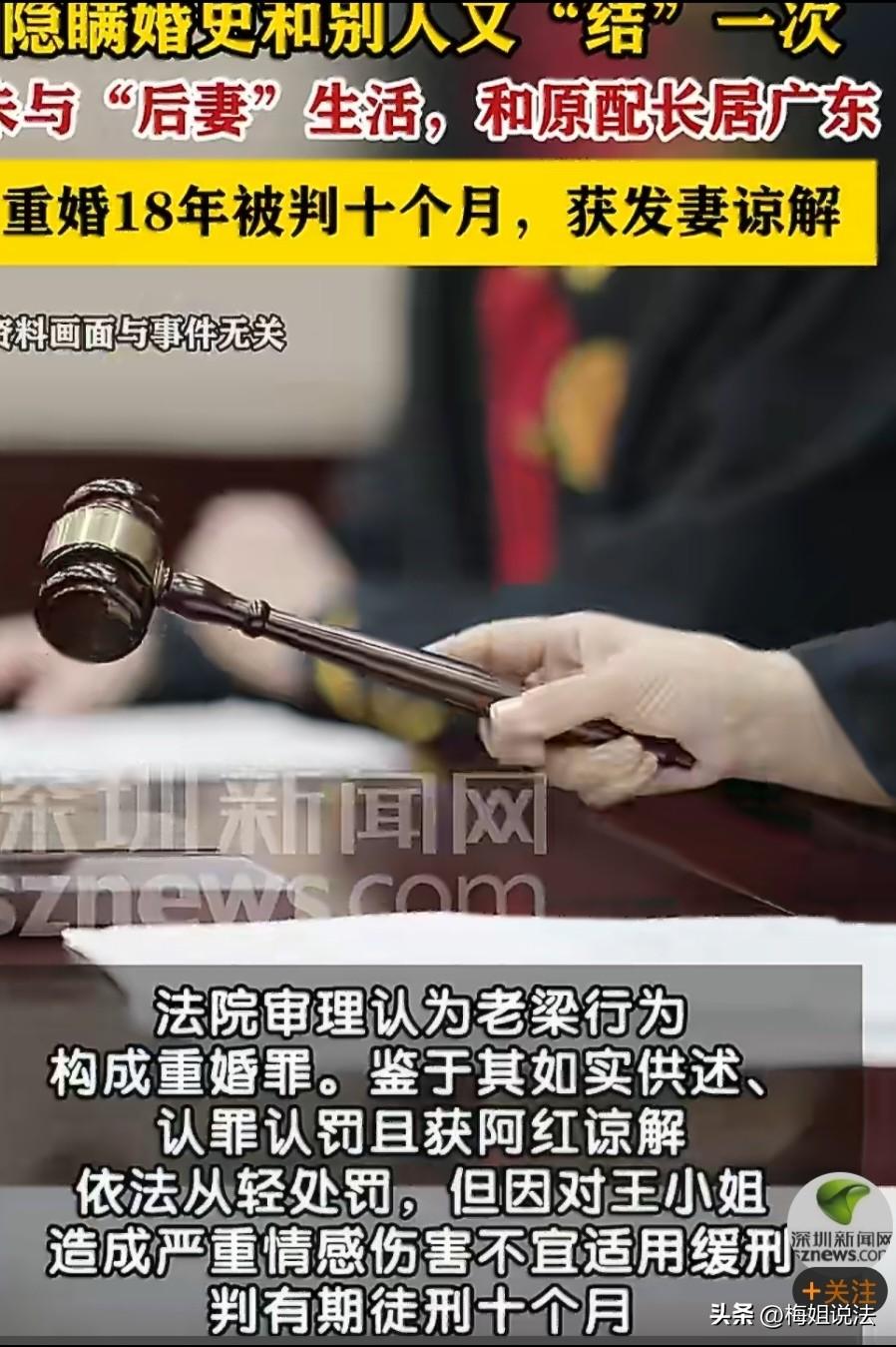 广东惠州,老梁在陕西老家和阿红结婚后,仅仅隔了9个月,又与武汉的王小姐结婚,还成功以未婚身份办理了结婚证,离谱的是,还骗过了原配18年,直至有了纠纷才被揭露,结果悲剧了。 起初,老梁与阿红是在陕西老家认识的,两人在一起干活,彼此都产生了好感。 不久以后,两家人就一起吃了饭,聊了两个孩子结婚的事,在那个年代,都讲究一个“先成家再立业”的说法。 两家都很着急,也不想因为彩礼的事情拖着,阿红一家便只提出一个小数目。 于是,在2006年的5月份,老梁与阿红就在陕西老家办理了合法的婚姻登记,正式结为了夫妻。 婚后两人的生活也十分的恩爱,彼此都很包容,在老家那里都是人们嘴里羡慕的一对。 不久后,阿红就怀孕了,老梁见自己身上名为“责任”的担子更加重了,便于阿红商量了说,自己想要去打工。 阿红即使不舍,但是她自己心里还是明白养家才是最重要的。 在2007年初,老梁就去湖北武汉打工了。在打工期间,老梁并没有公开自己已经结婚的事实,可没成想,自己老实,能干的性格使王小姐对他产生了好感。 王小姐觉得老梁一定是一个很负责任的人,很踏实,就想着能和他都进一步的发展。 她主动找到老梁说出自己的心思,老梁一开始便拒绝了,毕竟已经婚配了。 但是后面王小姐还是不死心,认为这只是老梁不太了解自己而已,于是常常对老梁有一个特殊照顾,主动给他准备餐饭。 这时间一长,老梁发现王小姐的好了,顿时感觉自己离不开了。 在2007年2月,老梁隐瞒了自己的婚姻,以未婚的身份,再次与王小姐办理了婚姻登记。 因为当年很多地方没联网,他撒的谎竟然没人发现。 王小姐和阿红一样,也没有要取彩礼。随后,阿红快要生产了,老梁就找了一个借口,回到了陕西老家。 随后,这18年间,老梁一直与阿红生活在一起,并没有与王小姐共同生活。 在2025年,因为老梁和王小姐的这段虚假婚姻关系产生了纠纷,这直接成为了一个导火索,揭穿了老梁18年来的重婚谎言。这个案件也正式进入了司法调查程序阶段。 庭审中,老梁对自己的重婚行为供认不讳,如实供述了案件的全部经过,并且自愿认罪认罚。 在2026年3月,一审判老梁犯了重婚罪,在审查阶段,作为原配的阿红,为了能使老梁罪行减轻,主动原谅了老梁。 根据《刑法》规定,有配偶而重婚的,或者明知他人有配偶而与之结婚的,处二年以下有期徒刑或者拘役。 这件事情表面上看起来阿红是受害者,其实不然,王小姐才是合法权益最受侵害的一方。 因为在这18年间,王小姐始终被蒙在鼓里,对老梁已有家室的事实一无所知,而老梁则一边享受着与原配的安稳生活,一边还让王小姐背负着有名无实的婚姻名分。 王小姐就好像被这场婚姻困在笼子里的鸟儿一样,这件事给她造成了极其严重的情感伤害。 在这件事上,不仅让王小姐失去了情感,还耗费了大量的青春。 最后,经过法院的审理,最终判决了老梁有期徒刑十个月,不过大家还是不太认可,纷纷认为惩罚太轻。 有人根据最近一直提出女方不应该索要彩礼的一事表达观点,认为这件事便是因为彩礼过少导致的,如果彩礼使男方压力过大,男方对婚姻的重视程度也会提高。 其实这么说是不对的,这件事就是因为两个字,“欺骗”才导致的,如果不是因为老梁的隐瞒,王小姐就不会在发现自己动心后,一直追求于他,阿红以及孩子也不会受他人议论,自己也不会产生犯罪,对家庭,生活造成不方便。 无论如何,希望这个案件能为大家敲响警钟,婚姻终归不属于儿戏,既然已婚,就要对妻子和家庭忠诚,负责任。 另外,但凡触及自己利益的事情,一定要慎重,严格调查清楚后再做决定,不然后果很有可能严重到无法接受。 不过,你对这件事的看法是怎样的呢?是否同意网友关于彩礼的看法呢?