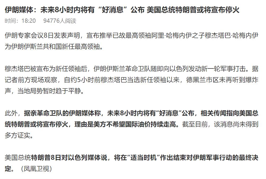 伊朗局势突然出现转机,一是伊媒说未来8小时内将有“好消息”公布;二是特朗普或将宣布“停火”,理由是不希望国际油价持续走高。 作为一个典型商人出身的总统,老川的行事风格向来都是,说最狠的话,做最现实的考量! 所以,特朗普哪天突然宣布“胜利”,单方面结束战争,这种可能性也是有的。 当然,这也可能是特朗普放的烟幕弹,故意“服软”;麻痹刚上台的哈梅内伊之子穆杰塔巴,然后找机会继续斩首!毕竟哈梅内伊也是打着谈判的幌子被“干掉”的,老川做这种事儿向来没啥底线。 刀锋认为,美伊冲突极限时间是4周,要么伊朗投降,要么老美退出不打了。所以对全球股市影响没有想象的那么大,什么百年大变局、第三次世界大战,更多的是自己吓自己。 今天到了第9天,至少对股市利好利空都开始钝化了!比如最受益的油气板块没有那么强,最利空的科技股也没有那么弱。