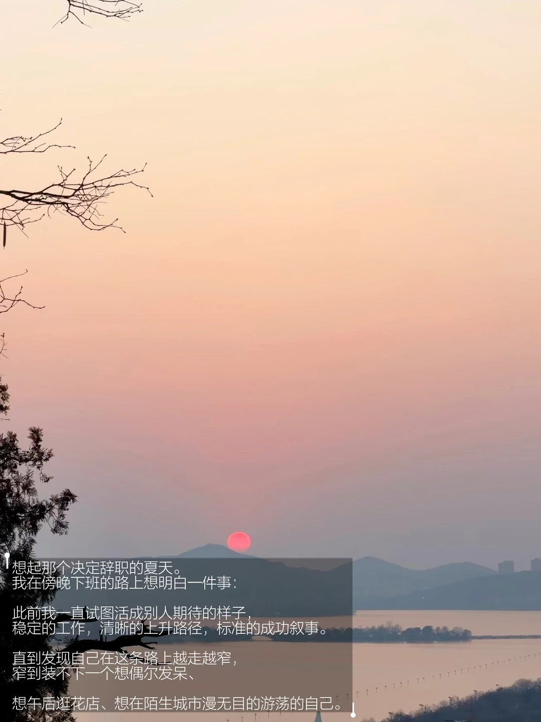 想起那个决定辞职的夏天。我在傍晚下班的路上想明白一件事:此前我一直试图活成别人期待的样子,稳定的工作,清晰的上升路径,标准的成功叙事。直到发现自己在这条路上越走越窄,窄到装不下一个想偶尔发呆、想午后逛花店、想在陌生城市漫无目的游荡的自己。