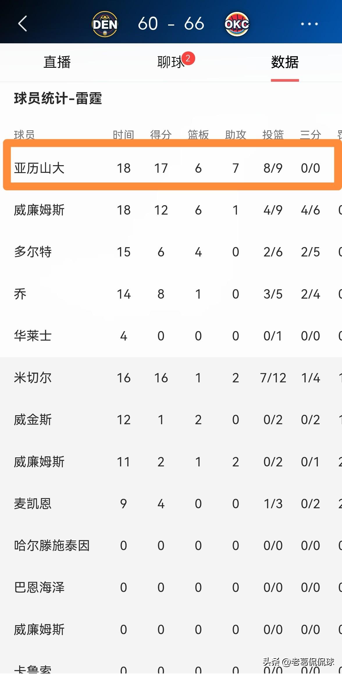 雷霆巨星亚历山大的进攻效率真是太吓人了!在今天雷霆主场迎战掘金的焦点战中,目前双方半场战罢,雷霆以66:60领先对手。在前两节比赛中,亚历山大打出了极其高效的进攻,他在首发出战的18分钟里,投篮9中8,其中罚球1中1无比高效的砍下17分,外加6篮板7助攻,没有出现任何的失误。 老实说,在上半场比赛中,亚历山大不仅展现出了超强的得分能力,而且展现出了非常强的传球能力,他送出了全队最多的7次助攻。