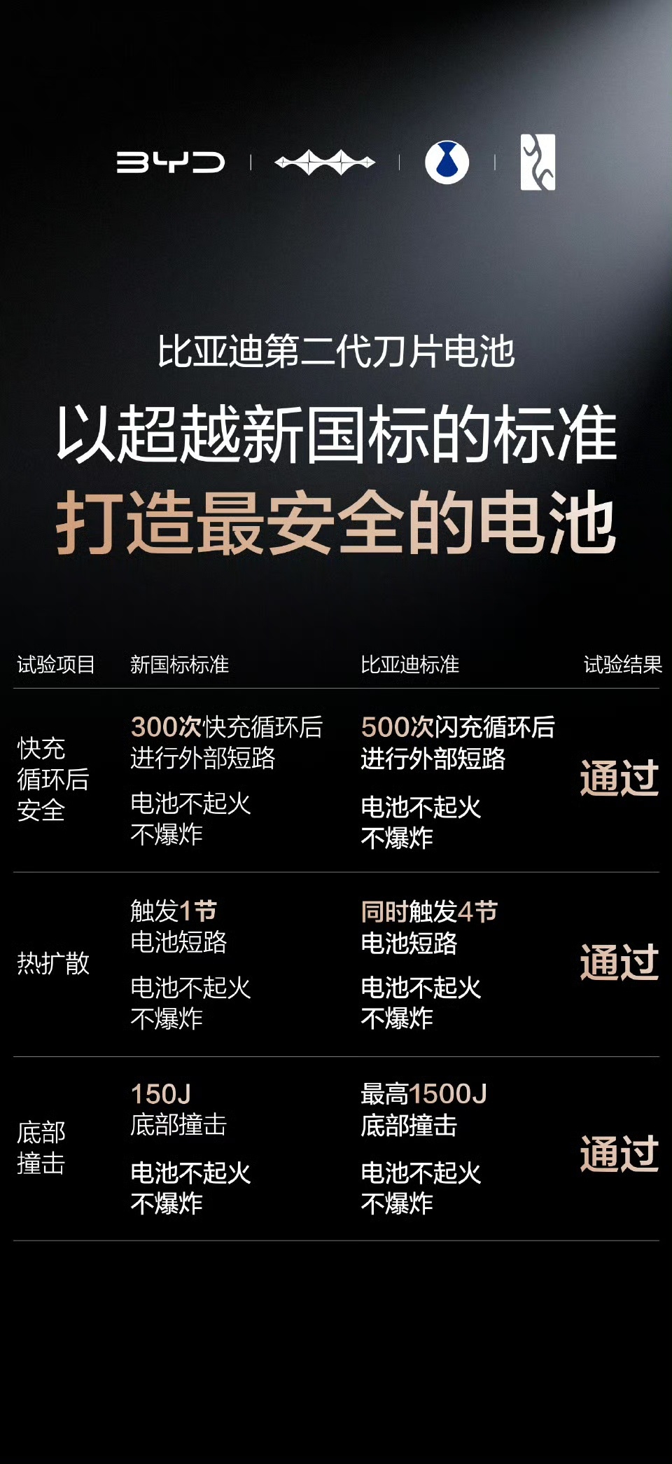 并且它靠核心技术把闪充对电池的伤害降到几乎为零,从根源上解决了快充与寿命的矛盾。安全试验更是卷到离谱,500次闪充循环后,边闪充边做针刺试验,电池没热失控、没冒烟、没起火。特别是要知道新国标要求触发1节电池热失控就行,第二代刀片电池直接挑战同时触发4节短路,还有底部撞击试验,10倍新国标能量撞下去,照样安全!