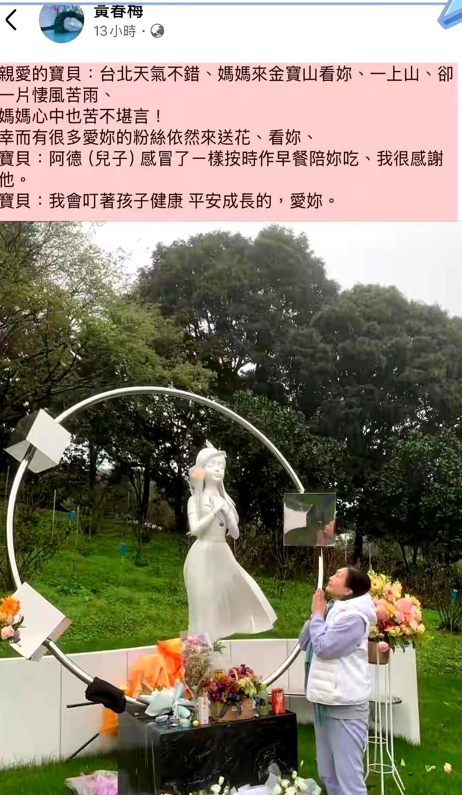 大S走了一年多,S妈现在最宽慰的事,是女婿具俊晔天天上山陪女儿吃早饭。 最近她又独自去金宝山看大S,上山还赶上凄风苦雨,本来心里堵得发慌。 一看见粉丝送的满处鲜花和饮品,又一下子暖过来了。 具俊晔最近感冒都没间断,天天带着大S生前爱吃的面包、黑咖啡上山,雷打不动。 S妈直接改口喊他亲儿子,还把外面传的争财产谣言直接怼回去,说自己根本不想打官司。 她现在就剩一个明确的念想,盯着两个孙辈平平安安长大。 之前整夜睡不着要找身心科的日子,总算是慢慢熬过去了。 走的人已经走远,活着的人把日子过顺,才是真的告慰。