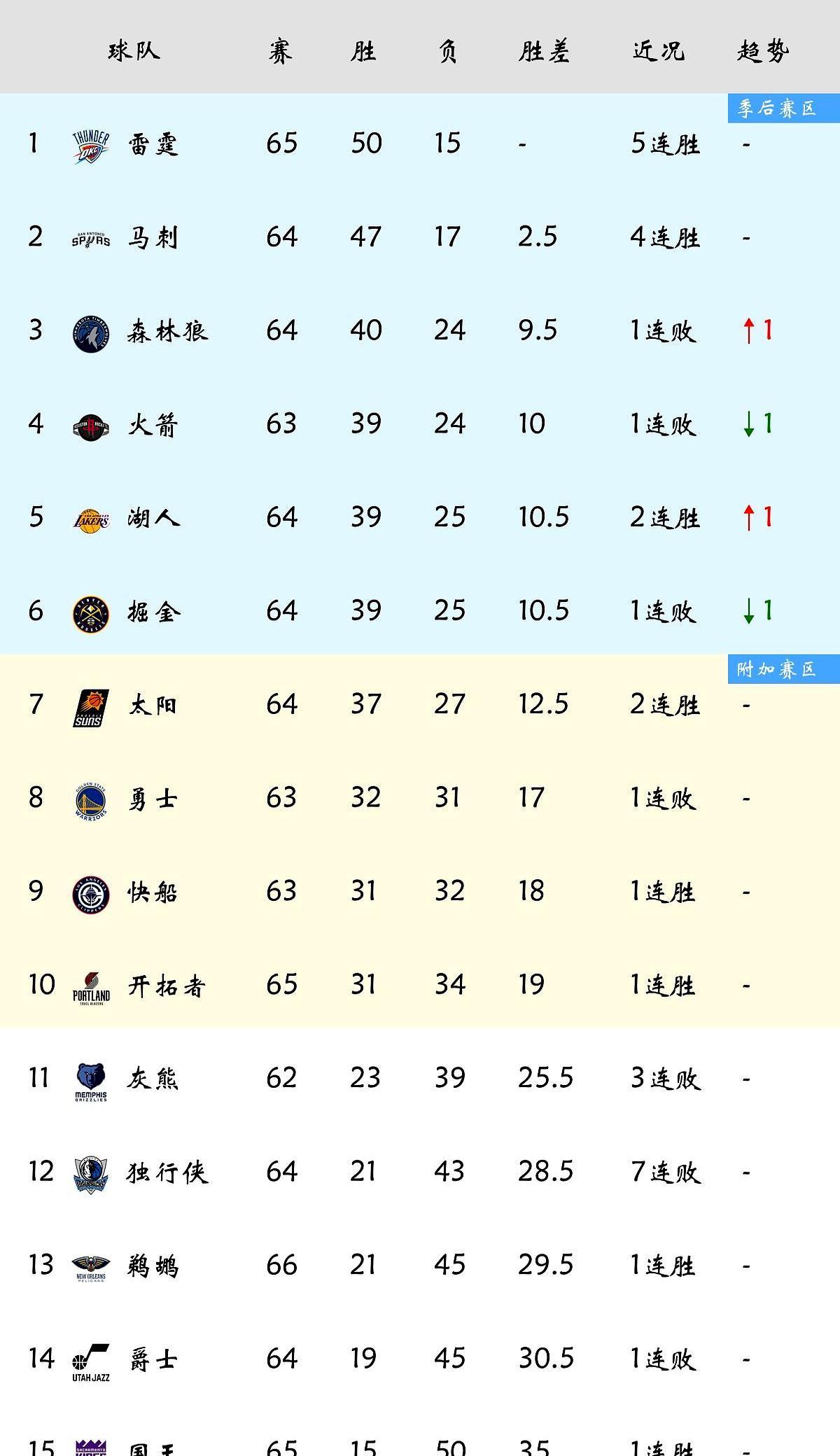 一觉睡醒,你支持的西部球队可能已经掉出前6了。 昨天3场球直接把西部3到6名的排名全掀了。 马刺145:120暴打火箭,拿了4连胜,稳坐西部第二。 湖人缺了詹姆斯,东契奇砍35分带队赢尼克斯,连拿2场。太阳也赢了黄蜂,布克拿了30分10助攻。 现在前2没什么悬念,雷霆50胜稳坐第一,马刺咬得很紧。 3到6名卷到离谱,火箭输球掉到第4,湖人凭胜负优势压过掘金升到第5,掘金直接掉到第6。 现在前6的直通季后赛席位,每输一场都可能直接掉去打附加赛。太阳现在排第7,离前6只差2个胜场,随时能挤上来。 接下来常规赛别跳着看,搞不好你睡一觉排名又换了。