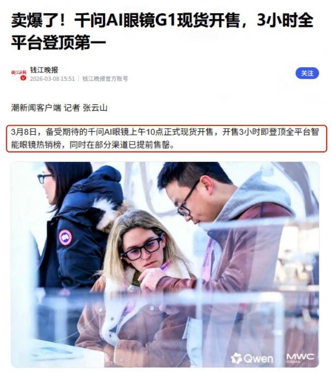 一副国产AI眼镜,彻底撕下了中国科技的“面具”,外媒直言真相藏不住了! 在刚刚结束不久的MWC 2026大会上,国产千问AI眼镜G1的亮相,彻底打破了外界对中国科技的固有印象,美国科技媒体CNET的记者体验后,直接发出“Meta可得小心了”的警告,展台前常年排起的海外观众试戴长队,更是用最直观的热度证明了,这款产品的硬实力。 这款千问首款AI硬件,能敢和全球AI眼镜巨头Meta正面对垒,且不落下风,绝非偶然,背后是实打实的技术沉淀、产品打磨和产业支撑。 千问AI眼镜G1的核心竞争力首先体现在硬件配置的精准发力上。整机重量控制在40克左右,差不多是普通光学眼镜的重量,搭配可调节支架和食品级硅胶鼻托,戴一整天也不会压鼻梁,这种轻量化设计直接解决了,很多AI眼镜“笨重难戴”的痛点。 硬件堆料不盲目追求参数噱头,而是直击用户核心需求,双旗舰芯片双系统的配置保证了运行流畅度,五个麦克风阵列加骨传导技术,让语音交互和收音更清晰,哪怕在嘈杂的会场环境也能精准识别指令。 影像能力更是看齐手机水准,0.6秒极速抓拍能定格瞬间画面,3K视频录制配合AI超分超帧技术能输出4K画质,再加上行业首创的Super RAW暗光增强技术,哪怕在光线不足的场景下,拍摄效果也能保持稳定清晰。 64GB的本地存储容量,在同类产品中算得上业内最大,足够支撑长时间的拍摄和数据存储需求。 最让人眼前一亮的是创新的“热插拔换电”设计,右镜腿可以直接更换电池,换电过程中还不会中断使用,彻底解决了智能设备的续航焦虑。 很多海外用户试戴后都对这个设计赞不绝口,毕竟之前的AI眼镜要么续航只有几个小时,要么充电时无法使用,而千问G1靠着这个设计,基本能实现全天在线服务。 这种从用户实际使用场景出发的创新,比单纯堆砌高端芯片更能打动市场。 AI交互能力是这款眼镜的核心护城河。它搭载了最新一代千问大模型,作为全球受欢迎的开源大模型之一,千问在多模态理解和实时交互上表现突出。 端到端语音交互时延低至1秒,视频交互时延也才1.5秒,对话响应速度堪比面对面交流。 支持AI翻译、会议记录、识图识物等多种核心场景,后续还会打通千问APP,上线点外卖、订酒店、打车等“AI办事”功能,真正实现“走出手机,进入物理世界”的智能体验。 阿里云推出的多模态交互开发套件,整合了千问、万相、百聆三款基础大模型,让眼镜不仅能听会说,还能看能思考,形成了完整的交互链路,这是很多同类产品难以比拟的技术优势。 价格策略更是让千问G1在市场竞争中占据主动。官方标价2899元,叠加国补和各类优惠后,到手价低至1997元起,直接把高端AI眼镜的门槛拉到了普通人够得到的水平。 要知道,海外同类AI产品价格往往是这个数的几倍甚至十几倍,高价一直是制约AI硬件普及的重要因素。 千问G1的定价不是牺牲品质的低价竞争,而是依托中国完善的产业链实现的成本控制,既能保证硬件配置不缩水,又能让更多用户体验到AI技术的便利,这种高性价比优势让它在国际市场上极具竞争力。 背后支撑这一切的,是中国强大的产业生态和技术积累。中国拥有全球最齐全的工业门类和顶尖的制造业供应链集群,从精密光学组件、高性能传感器到微型电池,都能实现本土供应,不仅响应速度快,成本控制能力也远超其他国家。 这种完善的供应链让千问AI眼镜能够快速实现规模化量产,开售3小时就登顶全平台智能眼镜热销榜,部分渠道还提前售罄,足以证明市场的认可。 同时,千问大模型的开源策略也起到了关键作用,开源的三款中型新模型性能优异,甚至能直接部署于消费级显卡,降低了硬件开发的技术门槛,让AI能力能更顺畅地落地到终端产品上。 面对全球AI眼镜市场85.2%份额被Meta占据的现状,千问G1的出现不是盲目挑战,而是找准了差异化竞争的突破口。 Meta的优势在于先发优势和生态积累,但千问G1凭借更贴合用户需求的设计、更强的性价比、更灵活的续航解决方案,成功撕开了市场缺口。 更重要的是,千问AI眼镜并非孤军奋战,全球智能眼镜市场前五名中,除了Meta,其余四家都来自中国,中国已经成为全球AI眼镜增长最快的市场,密集的新品发布和激进的定价策略,正在改变全球竞争格局。 千问G1还计划在2026年内全面进军国际市场,并且已经和Spotify、PayPal、Google Maps等主流国际生态服务深度适配,做好了全球化布局的准备。 这种“本土打磨成熟后走向全球”的路径,既依托了中国超大规模市场的试验田优势,又能根据国际用户需求进行适配,成功率远高于盲目出海。 它的成功不是偶然,而是中国科技从“跟跑”到“并跑”甚至“领跑”的一个缩影,不再是简单的技术模仿,而是基于自身产业优势和用户需求的自主创新。