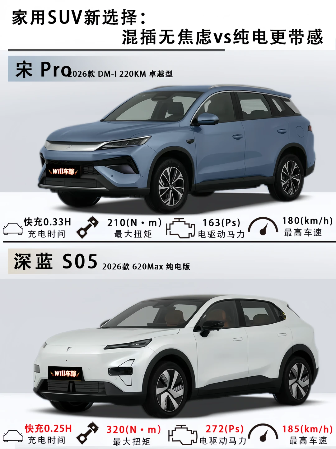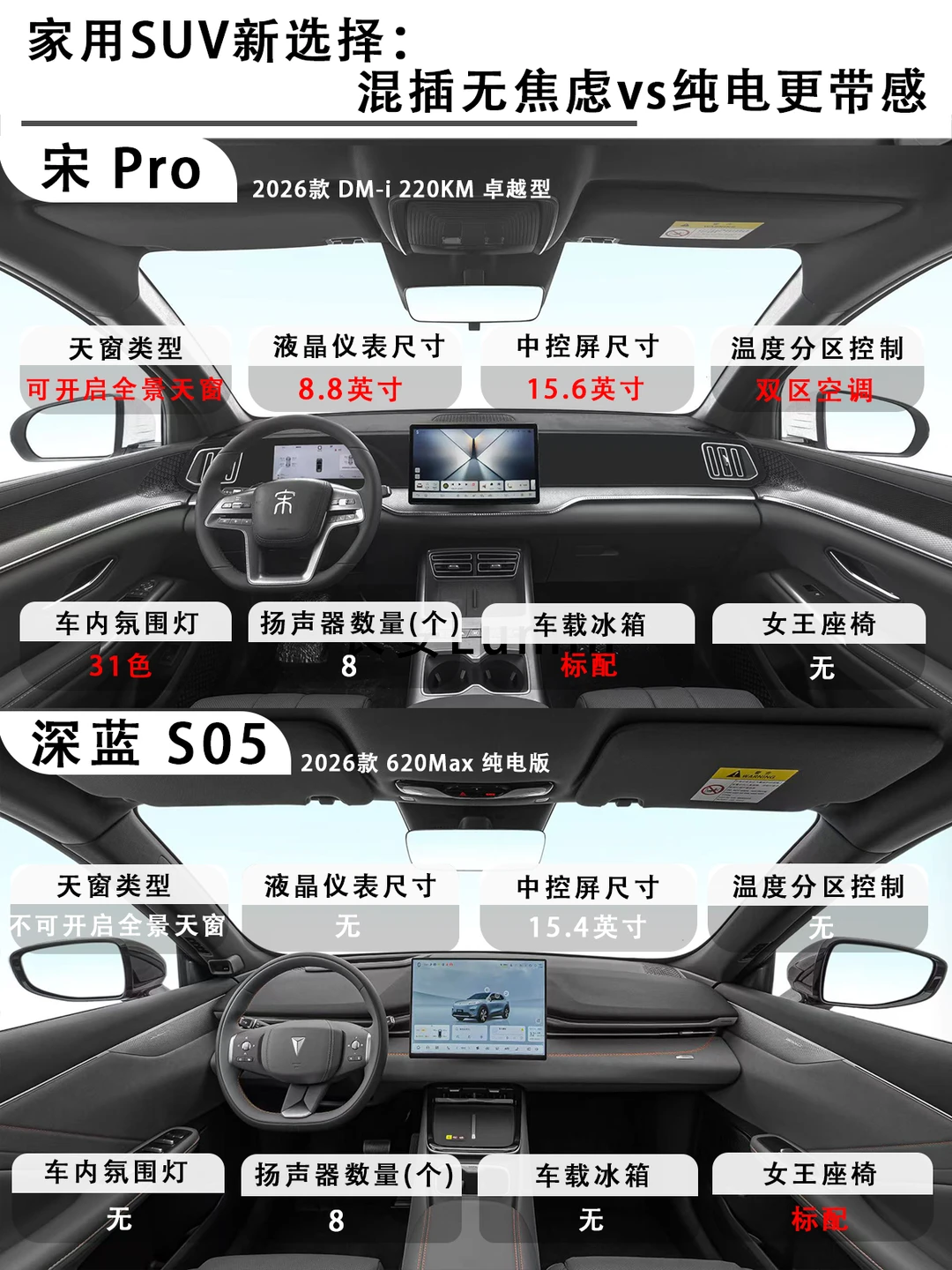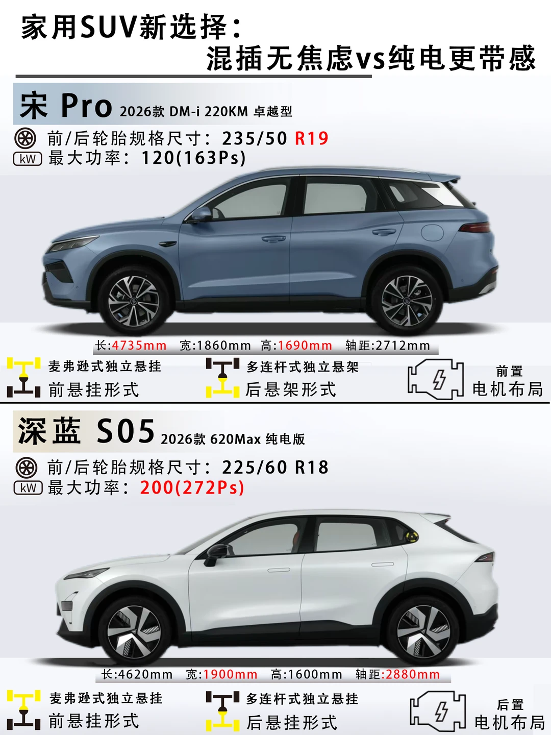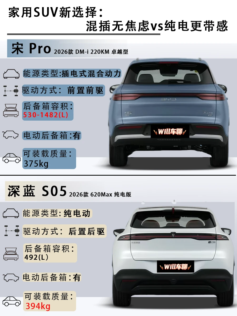 一边是能油能电的插混销冠,一边是后驱纯电的颜值黑马,今天把宋Pro DM-i 2026款 DM-i 220KM卓越型(以下简称宋Pro)和深蓝S05 2026款 620Max纯电版(以下简称深蓝S05)放一起比比,看完不纠结!