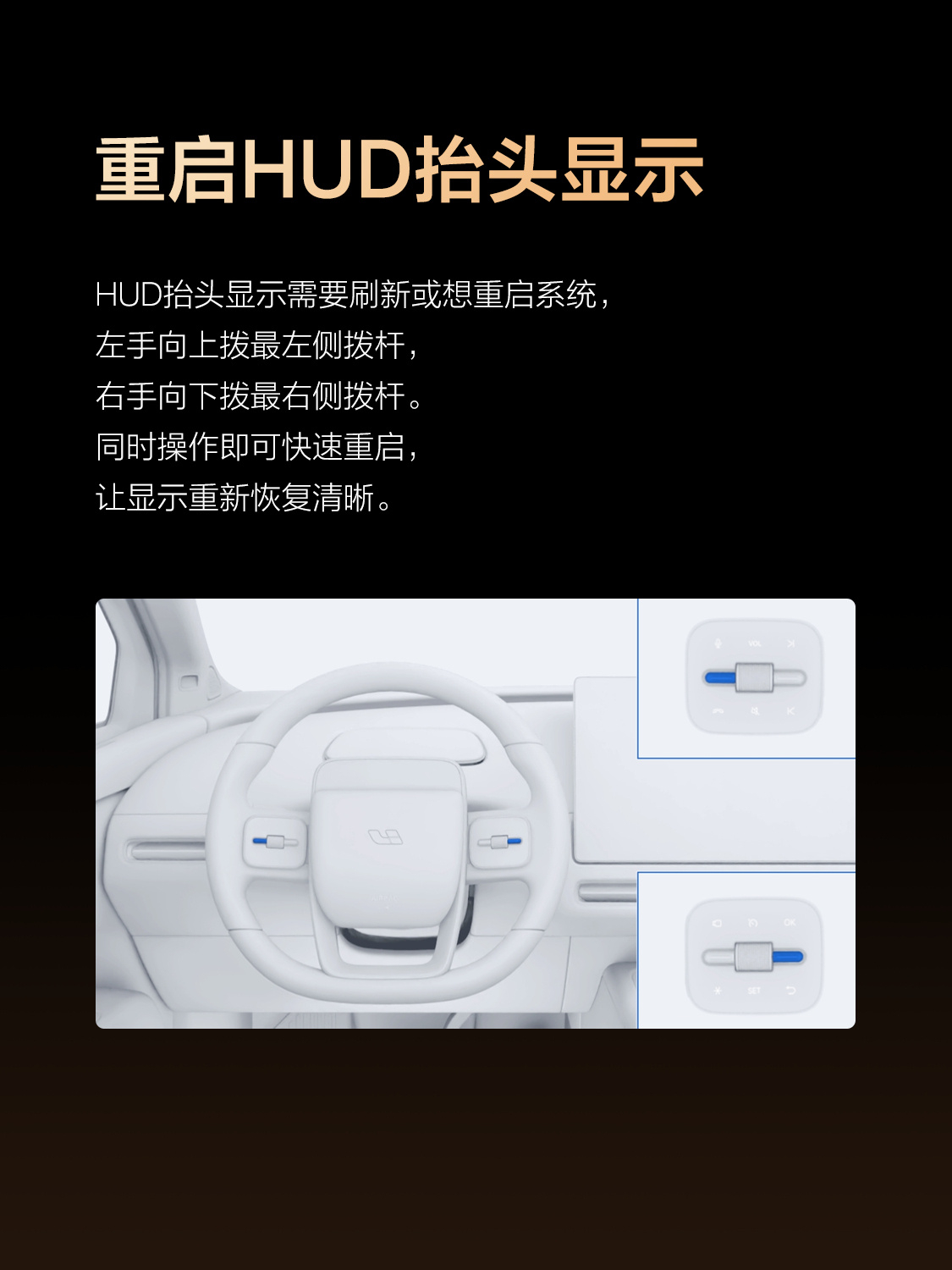 刚看到理想汽车官方发布的几个应急功能,确实在关键时刻能用上。首先就是重启HUD抬头显示,左手向上拨最左侧拨杆、右手向下拨最右侧拨杆,同时操作就能快速重启。再有就是电动解锁装置不响应时,车辆处于P档状态,长按10秒危险警告灯开关,就能一键开启。