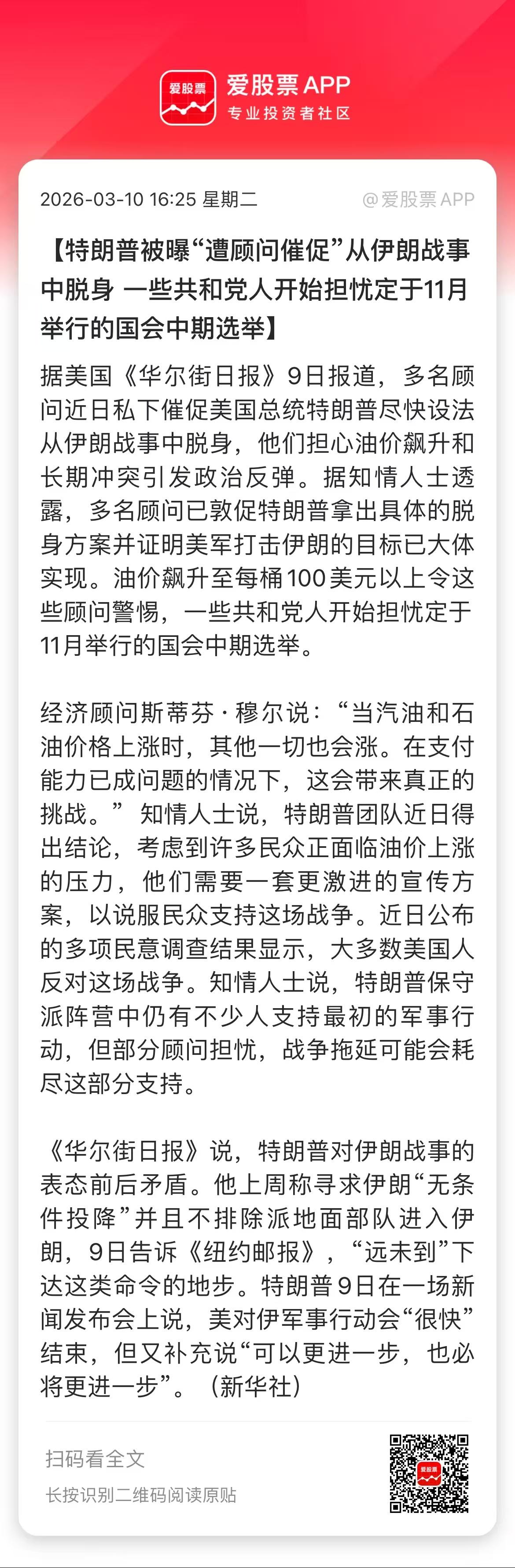 今天川普说,“这场战事已基本结束”,全球股市大涨!懂王一张嘴,市场跑断腿,现在各类风险资产被中东局势牵着鼻子走。 刀锋的看法,中东乱局不可能因为老川的一句话就结束,因为不是他想不打就不打的! 从老美的角度,你拍拍屁股走了,那美国在中东的军事基地怎么办?以色列内塔尼亚胡怎么办?那些交了保护费的中东王爷们怎么办?从伊朗的角度,老哈梅内伊刚被美国欺骗导致被斩首,小哈梅内伊这是家仇国恨,为了树立威信也必须强硬。 另外,特朗普一贯的TACO风格:你怂我就硬,你硬我立马怂。伊朗没有得到确定性保障之前,是不会完全解封霍尔木兹海峡的!谁知道哪天老川会不会突然变脸呢。 今天伊朗革命卫队回应称:战争何时结束,由伊朗决定。那么接下来,就看小哈梅内伊的表现了:到底是边打边谈,还是要彻底报仇,实现所有的战略目标! 现在对两方的考验是,一是伊朗开什么条件跟美国谈判,可以让国内“满意”;二是可以让川普也觉得自己“赢”了,为中期选举助力。 我的猜测,美伊冲突极限时间是4周!今天川普说基本结束,显然不会这么快。但市场对冲突的恐慌大体告一段落,今天A股主要涨的是科技方向,说明资金风险偏好提高了,这是一个好的信号。