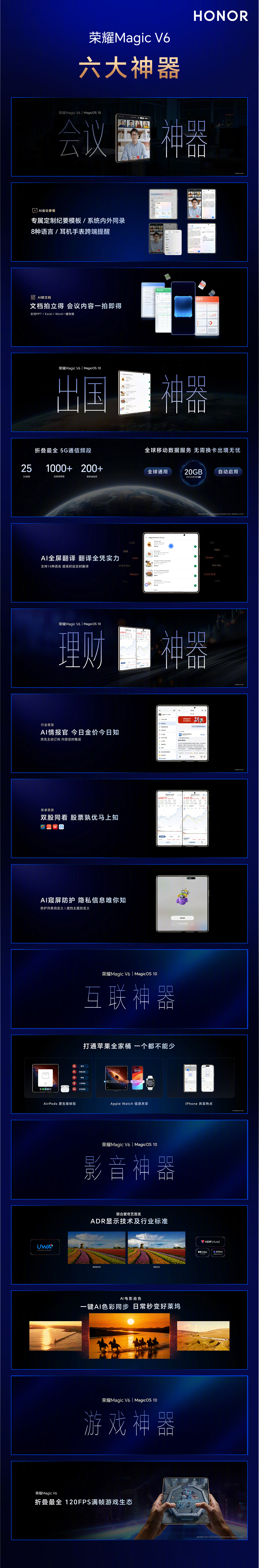 最后就是生产力方面,拥有AI会议参谋、智能跨端提醒、文档拍立得等功能,还首发了Mac一碰传,全面兼容iWork。总的来说,绝对是一台实力大满贯折叠屏手机,我觉得想考虑入手大折叠屏手机的小伙伴可以好好关注一下了荣耀发布会
