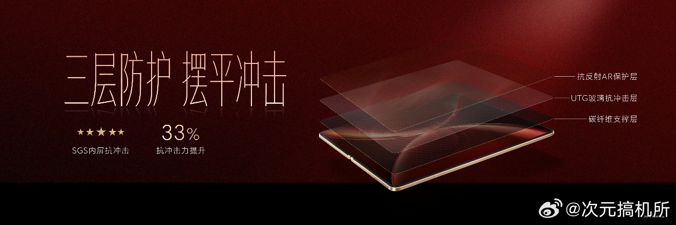内屏同样有至臻黑钻屏旗舰素质。全新升级超韧UTG玻璃,折痕相比上一代产品改善44%,通过了SGS无感知折痕认证,呈现出仿佛没折的平滑效果。同时,通过碳纤维支撑层、UTG玻璃抗冲击层、抗反AR保护层等三层防护,抗冲击力提升33%,由内到外,可靠属性拉满。