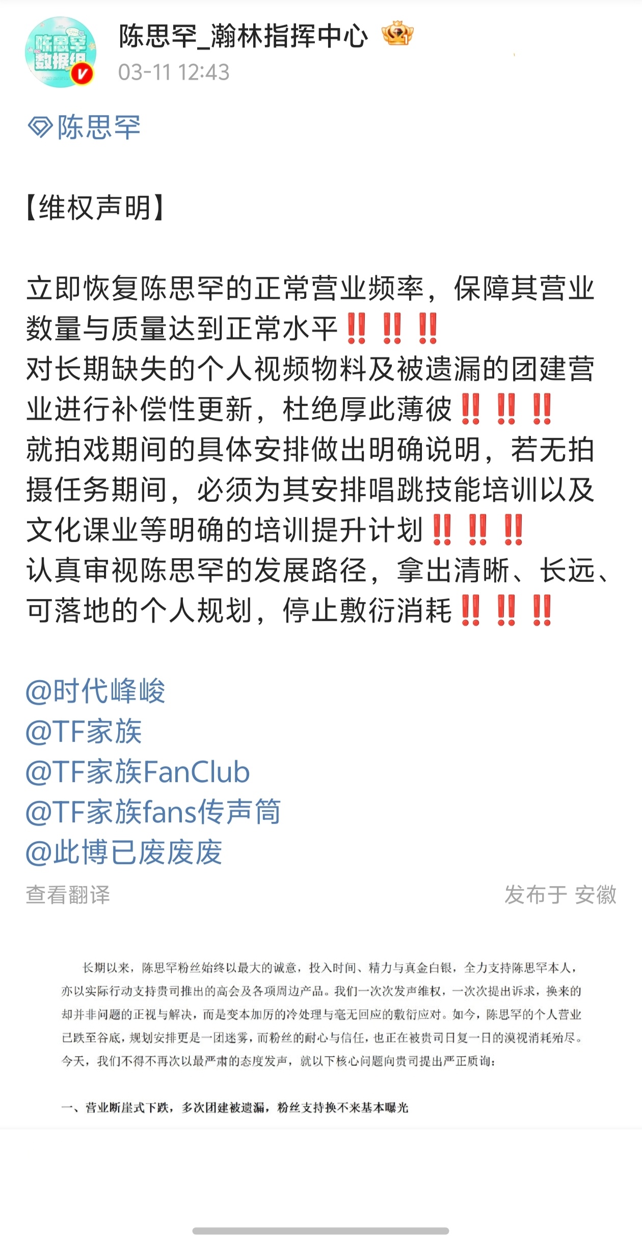 陈思罕粉丝维权,要求保障陈思罕正常营业曝光。