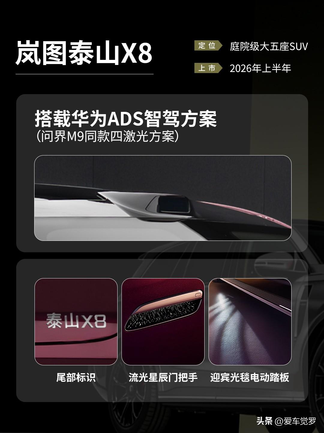 即将登场!据岚图汽车董事长卢放透露,全新车型“泰山X8”将于3月19日正式亮相。作为岚图与华为深度合作的力作,新车将首搭华为全新一代智能座舱,并首发多项黑科技,主打“庭院级”舒适豪华大空间,致力于成为大五座SUV市场的革新之作。从设计理念看,开阔通透的感官体验让人联想到居家般的惬意。在智能化浪潮下,华为座舱的加持能否让泰山X8脱颖而出?3月19日,我们拭目以待!@岚图汽车