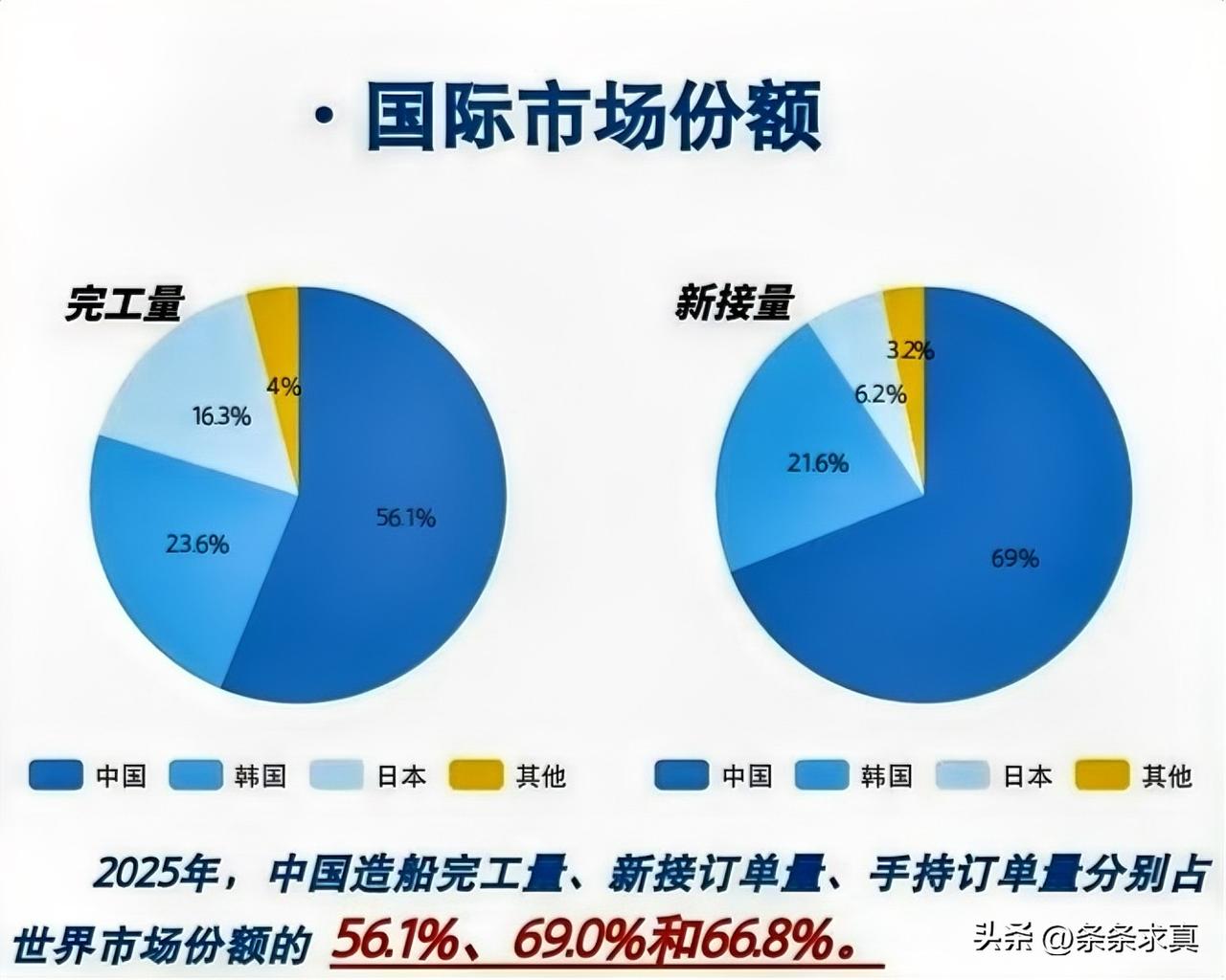 这两年的地缘冲突,让全球1/3的海运石油堵在波斯湾出不来。油轮被迫绕行好望角,单程多走几千海里。导致运价暴涨,船东们赚得盆满钵满,但下一秒他们就发现一个更扎心的问题:想造新船?先排队,队尾已经排到2029年。而这条长队的前端,站着同一个国家——中国。 2024年,全球新船订单成交量为106艘、387万总吨。其中,中国承接了95艘、347万CGT,拿下了全球市场的90%!除中国之外的其它200多个国家和地区,总共拿下了全球市场的10%! 2026年1月,全球新船订单成交量为158艘(561万修正总吨),中国船企承接了106艘(374万修正总吨),以67%的全球市场占有率继续位居榜首。韩国船企接单26艘,市占率22%,位居第二。也就是说,中国船企的接单量按艘数计是韩国的4倍。 中国每建造10艘船,就有近9艘服务于全球航运市场。中国造船业领跑全球,不仅是在量上领先,更是在质上不断提高。在造船技术上从仿制引进到自主创新,中国造船业已经在国际赛道中跑出了加速度。从“造船大国”到“服务全球”,这个转变只用了三代人的时间。