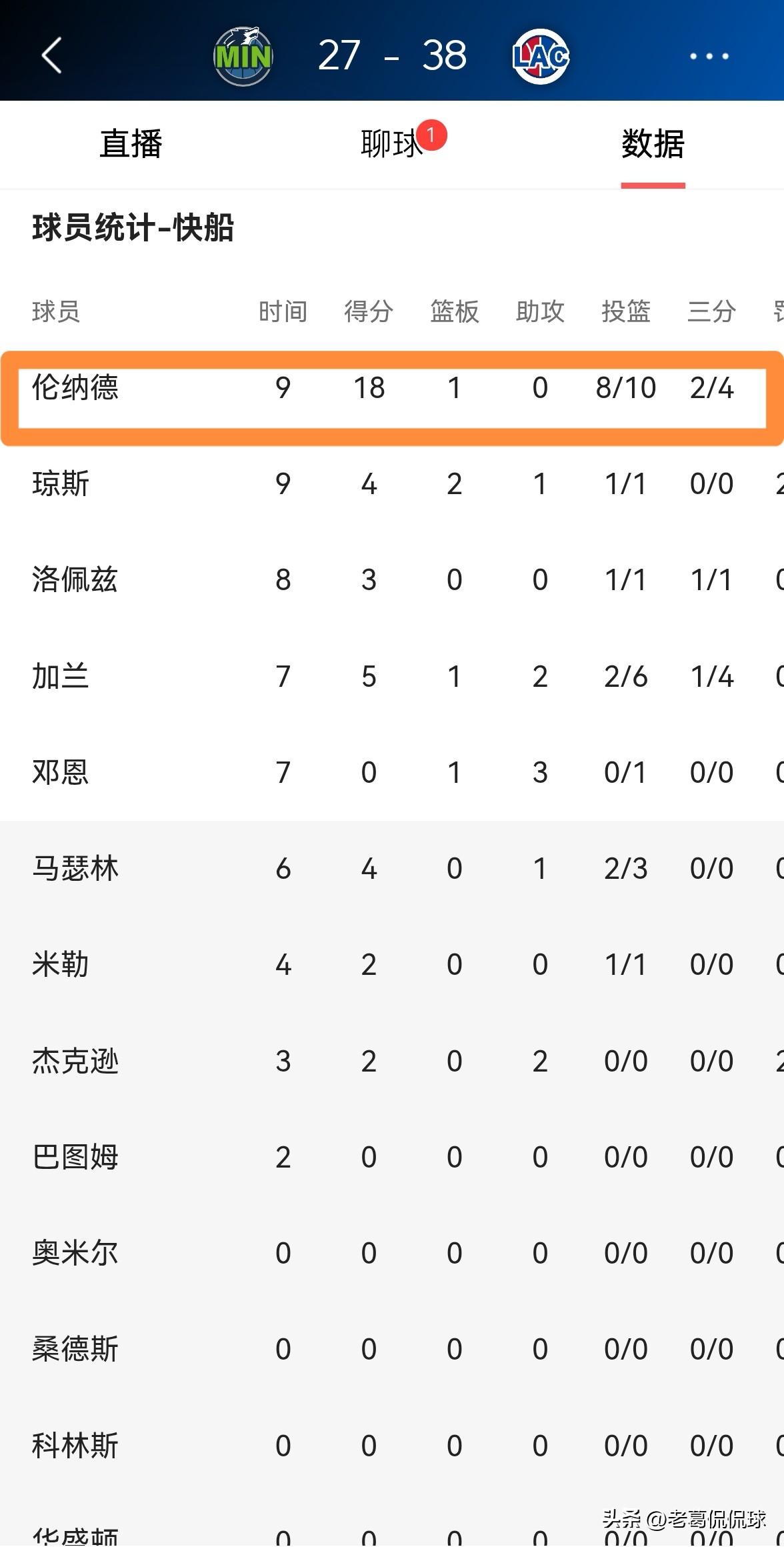 快船超级球星伦纳德的表现真是太完美了!在今天快船主场迎战森林狼的比赛中目前双方的首节比赛已经结束,快船凭借着伦纳德的完美表现以38:27领先对手。 在第一节比赛中,伦纳德首发出战9分钟,投篮10中8,其中三分球4中2极其高效的轰下18分,没有出现任何的失误和犯规,他的场上正负值为+14。 老实说,伦纳德在第一节比赛中的表现堪称完美,他在进攻端几乎是百发百中。
