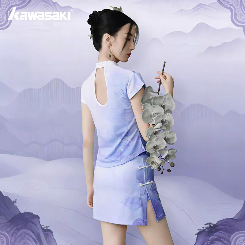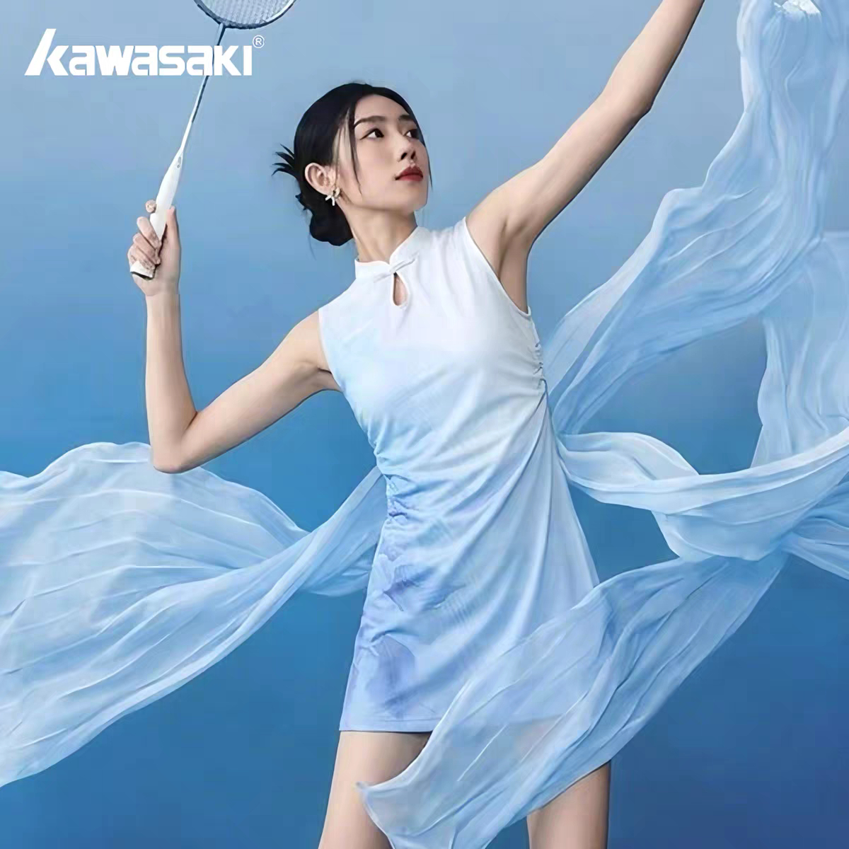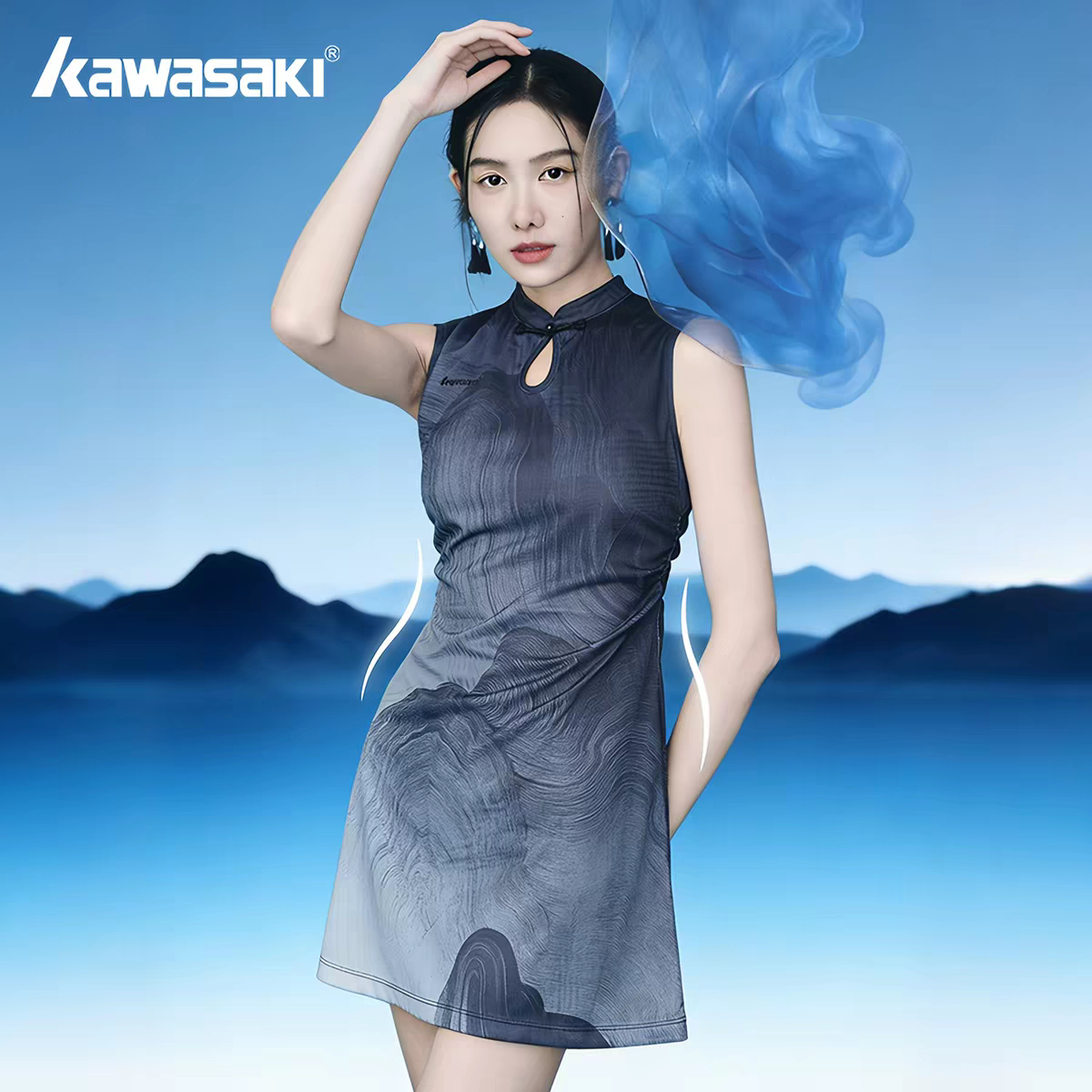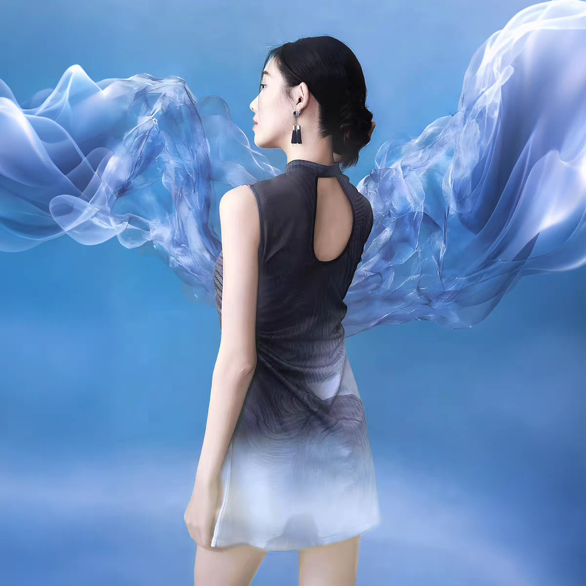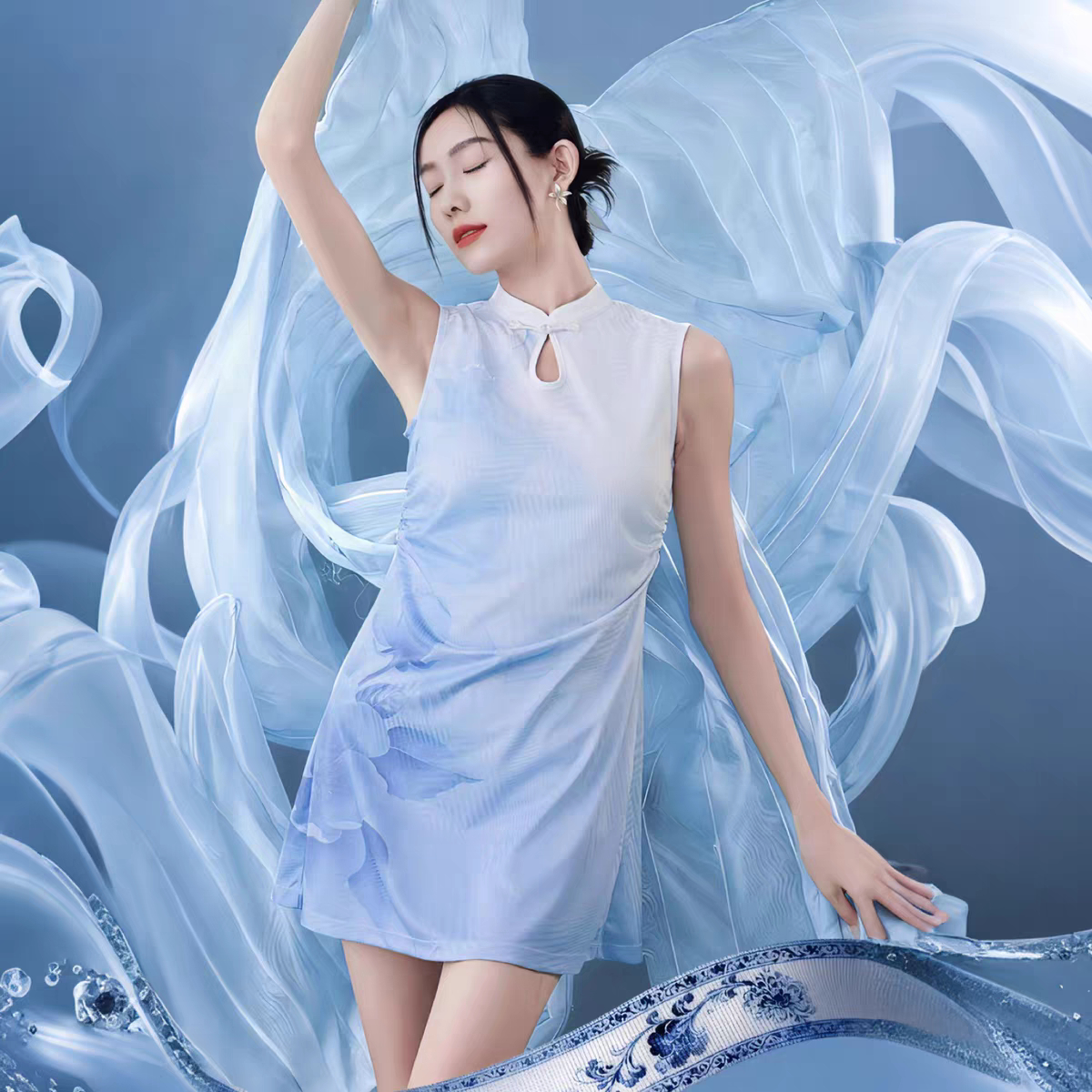 “新中式青花瓷国风立领无袖气质运动连衣裙”