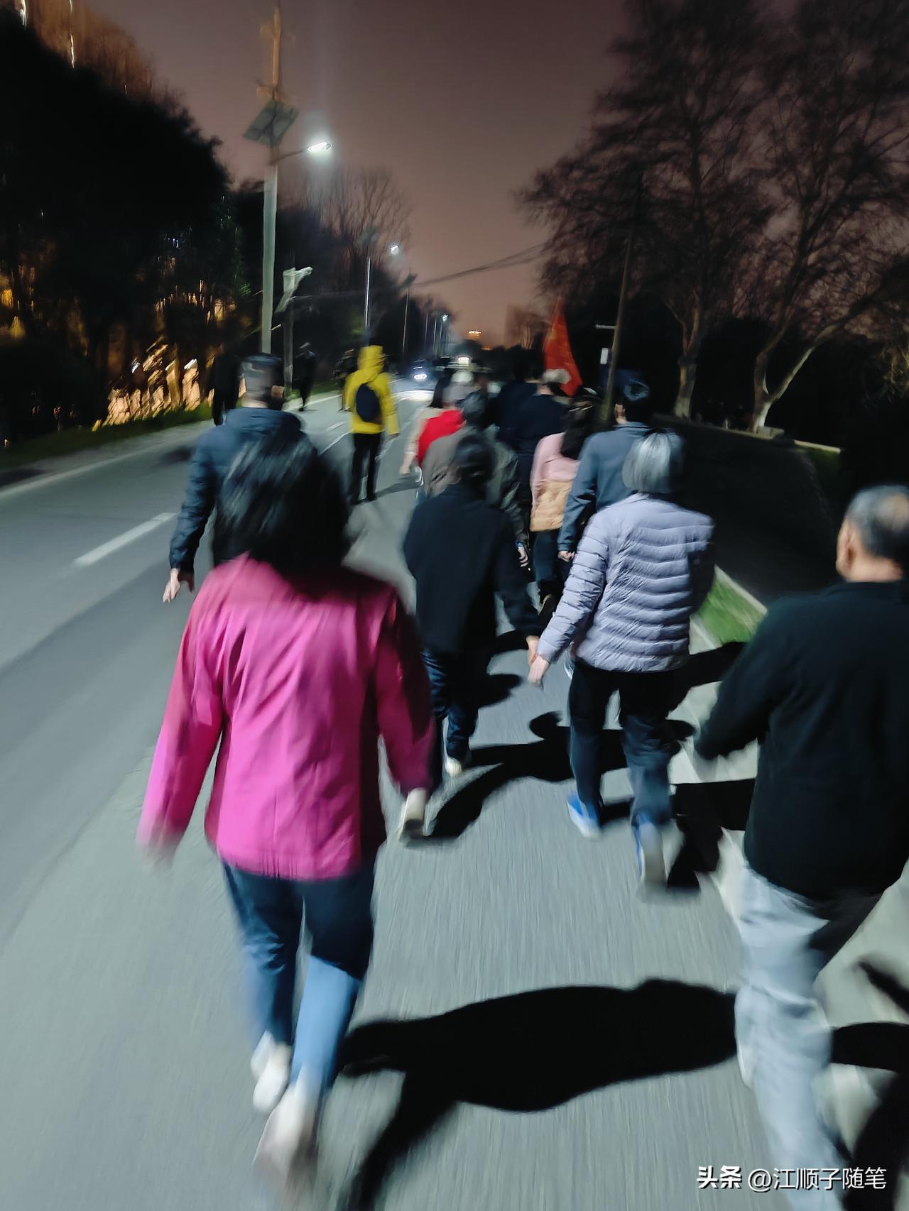 走着走着队伍还越滚越大,遛狗的大叔、下班的年轻人、跟我一样来减肥的,全都默默凑过来。到大堤开阔地,黑压压一长溜人齐刷刷往前走,脚步声哐哐的,路边阿姨都举着手机拍这民间大阵仗。