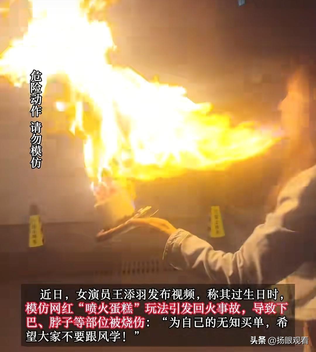救命!玩喷火蛋糕直接烧伤了😭 我今天刷到个真的惊魂的视频,必须来提醒一下大家! 女演员王添羽生日为了跟风玩“喷火蛋糕”,结果差点出事!😱 她含了一口高浓度酒往蛋糕火焰上喷,本来想拍出酷炫效果,结果因为嘴边残余酒精,火焰直接反向喷回脸上! 下巴、脖子瞬间起火,头发和睫毛都被点着了,场面真的太吓人了… 事后她也特别自责,说这是为自己的无知买单,还真心呼吁大家:千万不要模仿!太危险了!❌ 💥 硬核科普时间 专业喷火艺人都在说: 1. ❌ 绝对不能用酒精/汽油!极易爆燃 2. ❌ 绝对不能逆风喷火!风一吹就回烧脸 3. ❌ 小白绝对不要随便尝试!这是高危技艺,需要专业训练 本来是开心过生日,结果却弄伤了自己,真的太得不偿失了。 网红玩法跟风需谨慎,安全红线真的不能踩! 大家看到这种危险操作,一定要远离呀!转发给身边爱凑热闹的朋友提醒一下!🙏