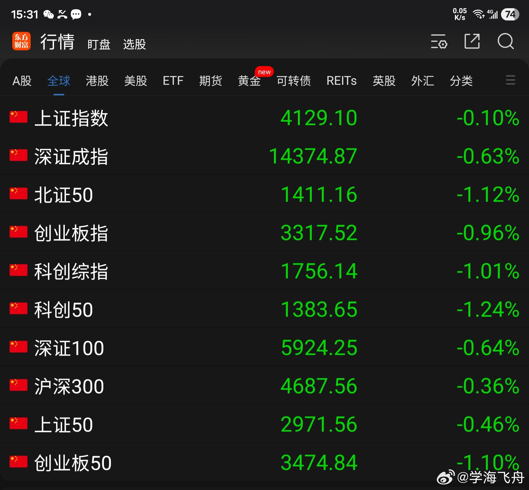 今天A 股大盘震荡下行,走势弱于昨天:东方财富App显示的10项指数全体下跌收绿。个股亦沿袭了昨天跌多涨少的走势: 沪深京三交易所中,上涨的股票有 1494 支,比昨天少 576 支, 其中涨幅在 7% 以上的有 104 支,比昨天少 6 支; 持平的股票有 95 支,比昨天少 43 支;下跌的股票有 3893 支,比昨天多 609 支, 其中跌幅在7%以上的有 25 支,比昨天多 19 支。三个市场全天的成交量为 24508 亿元,比昨天小幅缩量 776 亿元,再次失守 2.5 万亿元关口。今天的A 股量价齐跌,可见中东战事的影响尚存,控制仓位,多看少动为佳