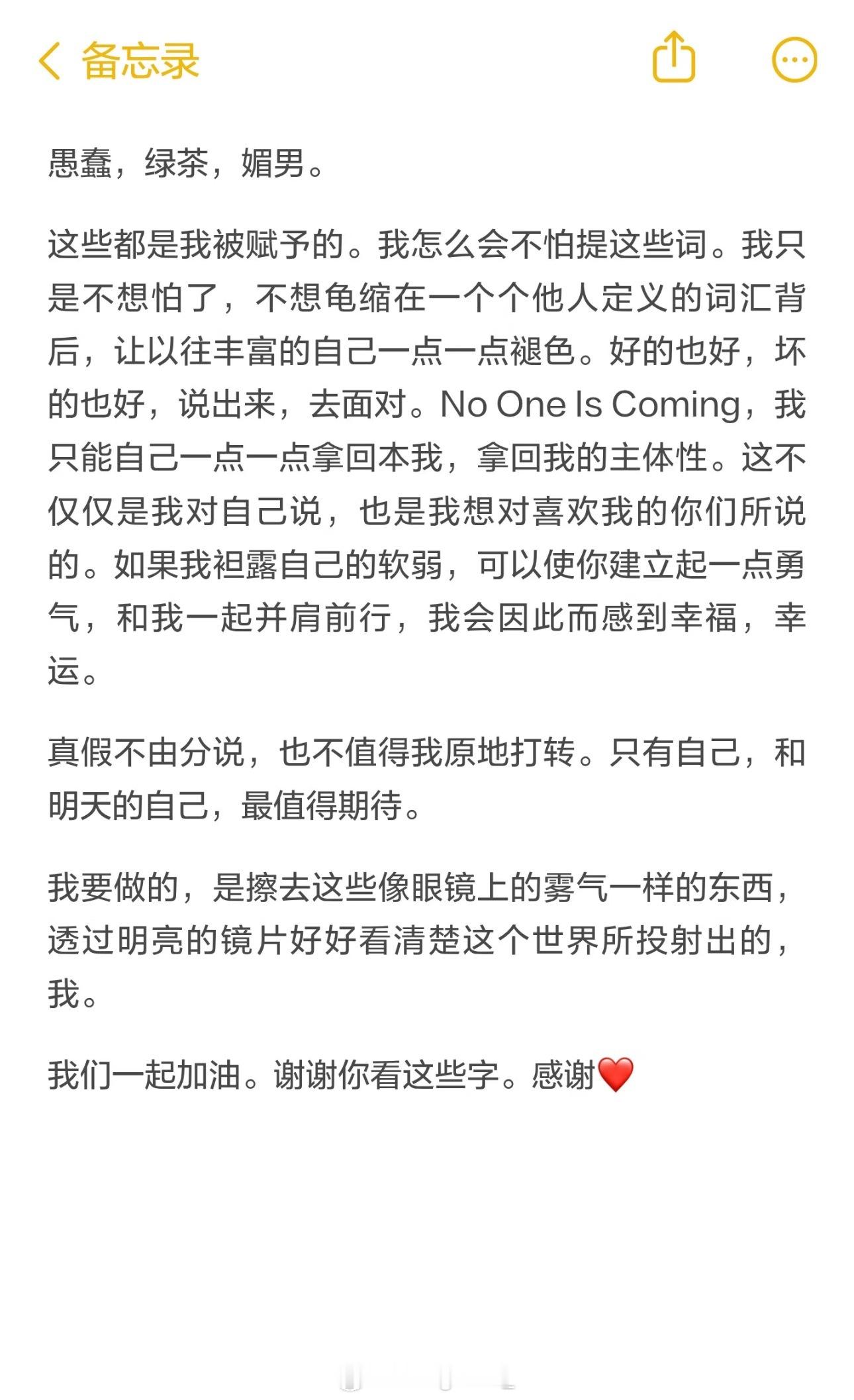 愚蠢,绿茶,媚男。这些都是我被赋予的。我怎么会不怕提这些词。我只是不想怕了,不想龟缩在一个个他人定义的词汇背后,让以往丰富的自己一点一点褪色。好的也好,坏的也好,说出来,去面对。No One ls Coming,我只能自己一点一点拿回本我,拿回我的主体性。