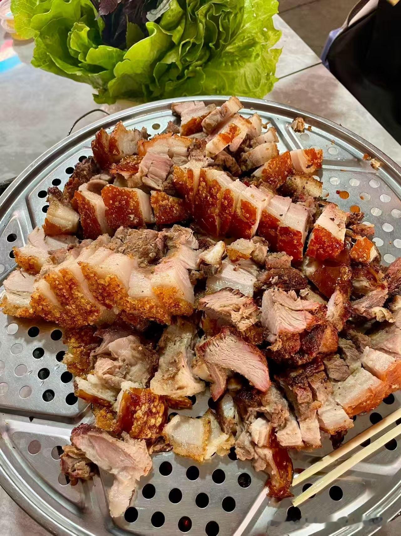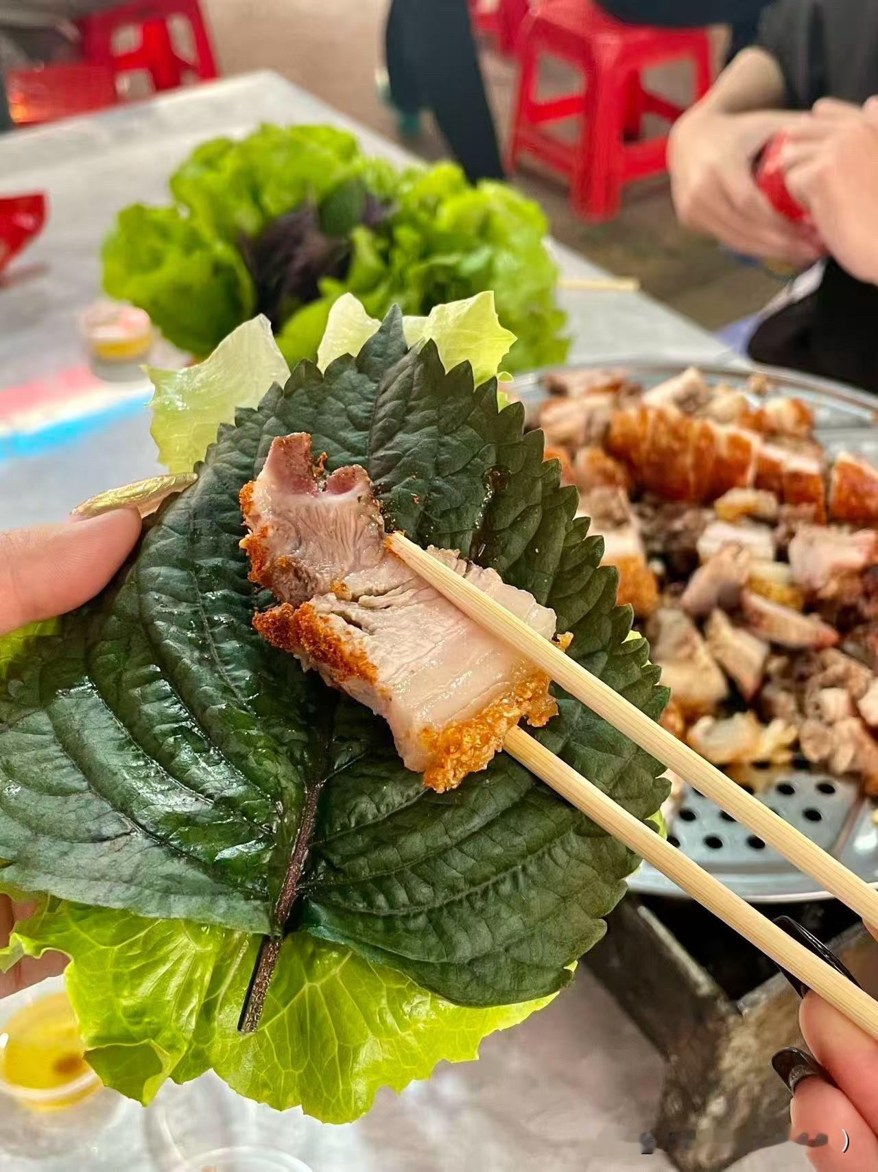 【扶绥脆皮烤猪】真正意义上满满的烟火气息,每个摊位都爆满,围坐一炉前,烤猪皮酥脆吃到嘴里咯吱咯吱的,主体一个咸香味为主,有点淡淡的沙姜粉香味,猪肉沾上椒盐或者酸梅酱配合紫苏叶生菜夹在一起,肥而不腻,爽口开胃。 体验感拉满[666]下次还会想吃的东西。