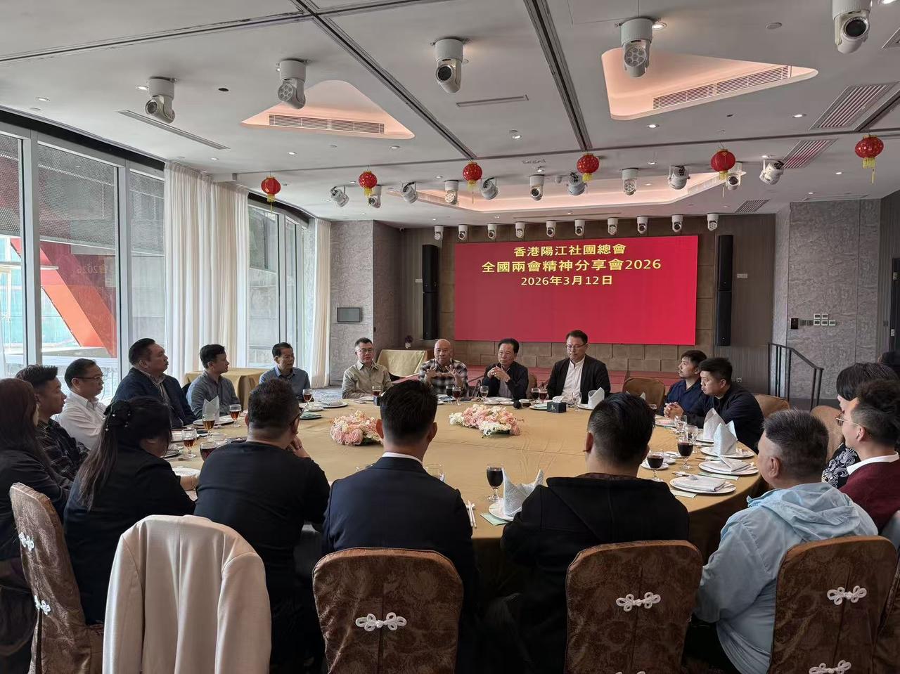 热烈恭贺全国两会胜利闭幕 香港阳江社团总会及阳江市政协委员举办2026年全国两会精神分享会 ——香港社团首场两会精神宣讲凝聚共识、助力由治及兴 2026年3月12日下午,热烈恭贺全国两会胜利闭幕,香港阳江社团总会联同阳江市政协委员,在香港举办全港社团首场2026年全国两会精神分享会。活动以「学深悟透两会精神、凝聚香江发展合力」为主题,深入学习宣传贯彻全国两会重要部署,引导会员与各界乡亲准确把握国家发展脉搏,坚定支持行政长官和特区政府依法施政,以实际行动推动香港加快实现「由治及兴」。 会上指出,学习、宣传并贯彻好全国两会精神,是香港当前和今后一个时期的重要政治任务。这既是香港紧跟国家高质量发展步伐的关键抓手,更是凝聚社会共识、汇聚发展动能、推动长繁荣稳定的强大支撑。与会者一致表示,要深刻领会中央对香港的深切关怀与全力支持,把两会精神转化为服务社会、推动发展的具体行动,凝聚力量服务社会,坚定支持特区政府依法施政,全面贯彻「一国两制」,团结广大乡亲,为香港的长期繁荣稳定贡献「阳江力量」。 今年两会期间,领导人为国家高质量发展和发展新质生产力把舵定向,为香港指明前进方向。对香港而言,必须牢牢把握国家全面深化改革、扩大高水平对外开放的重大机遇,充分发挥「背靠祖国、联通世界」的独特优势,把制度优势转化为发展新动能,在服务国家大局中巩固提升自身竞争力。 丁副总理在两会期间参加港澳代表团和委员小组审议讨论时的重要讲话,为香港落实中央精神提供清晰路径。讲话殷切期望香港社会各界全面认识「行政主导」政治体制,坚定支持特区政府依法施政,筑牢安全底线,集中精力拼经济、谋发展、惠民生。与会者认为,香港必须主动对接粤港澳大湾区建设等国家战略,加快融入国家发展大局,切实排解民生忧难,让发展红利惠及全体市民,特别是为青年创造更多向上流动的机会。 分享会强调,国家顶层设计为香港未来提供坚实保障。《政府工作报告》明确支持香港巩固提升国际金融、航运、贸易中心地位;「十五五」规划纲要进一步深化香港战略定位;《国家发展规划法(草案)》涉港内容提供坚强法治支撑。一系列政策赋能,充分彰显国家将香港纳入整体发展布局的深远考量,为香港与内地优势互补、协同发展构建长效机制。与会乡亲纷纷表示,将促进港阳经贸合作,善用香港国际化优势,推动两地企业在创科、商贸等领域的深度对接,协助家乡招商引资,实现互利共赢。 香港阳江社团总会主席冯权开先生表示,作为爱国爱港社团,总会将持续推动两会精神进社区、进基层、进家庭,团结带领广大乡亲与市民,坚守「一国两制」初心,积极参与香港治理与社会建设,为推进中国式现代化、实现中华民族伟大復兴贡献香江力量。 香港阳江社团总会会长魏仁康先生表示:今年全国两会,是十五五开局的重要会议,聚焦高质量发展、科技创新与民生福祉,方向清晰、举措务实。大家认真学习两会精神,凝聚共识、团结奋进,把会议要求落到社团工作与服务社群当中,同心同向、实干担当,携手共促发展。 来自社会各界的社团骨干、政协委员、乡亲代表等出席本次分享会,现场气氛热烈、交流深入,达成广泛共识。