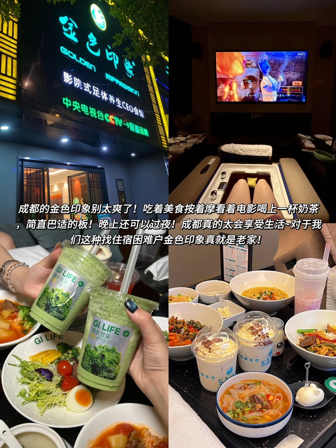 2⃣如果想体验成都特色按摩,那么可以冲一波金色印象!一边按摩一边吃美食再看看电影还能过夜!别太爽!这也是成都人民很喜欢的娱乐~她家还有行李可以存,来旅游的姐妹也不用担心啦
