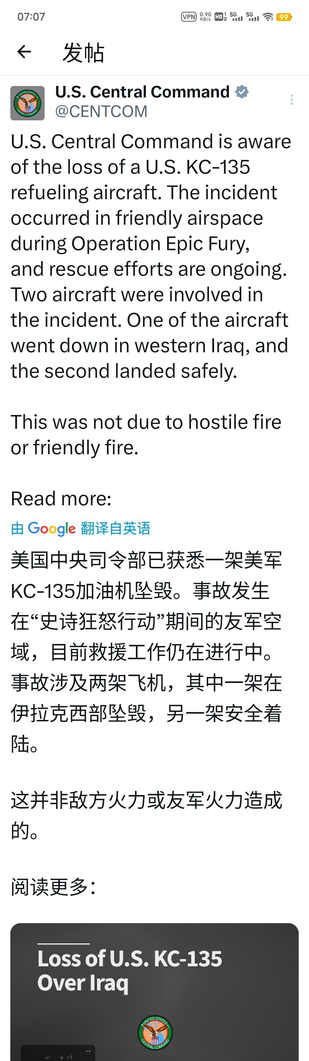 美国中央司令部证实,一架美军KC-135空中加油机失事。事件发生在“史诗狂怒行动”期间的友方空域,目前救援行动仍在进行中。此次事件涉及两架飞机:其中一架在伊拉克西部坠毁,另一架已安全降落。事故并非由敌方火力或友军误击导致。后续将根据事态进展发布更多信息。