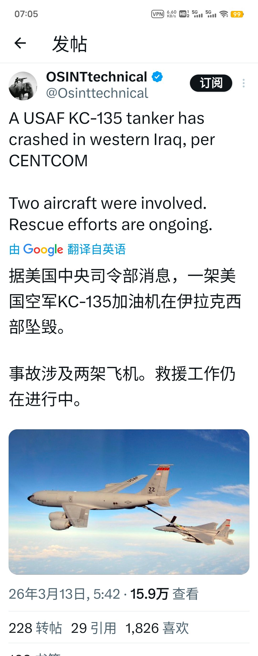 突发!首次美中央司令部证实,一架美军KC-135空中加油机失事,坠毁机上6名机组人员,生死未卜,另外一架安全降落!