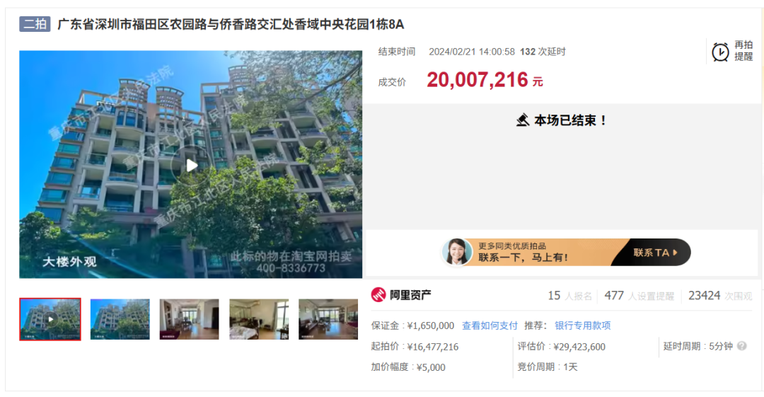 就在两年前的2024年2月21日,香域中央1栋8A的一套约133㎡房源法拍,当时15名竞买人,经过145轮激烈竞价,最终以2000.7万成交,折合单价15万/㎡,围观人数超过2.3万人。