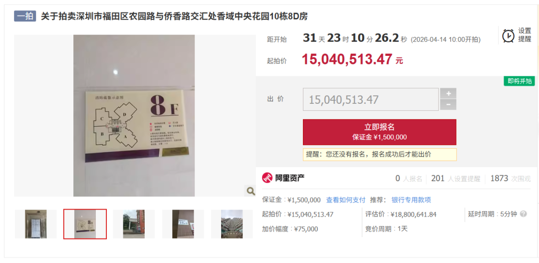 近日,阿里法拍平台上架了一套足以让整个香蜜湖业主圈震动的房源——香域中央花园10栋8楼,建面约203.62平方米,起拍总价约1504万,折合单价仅7.5万/㎡。