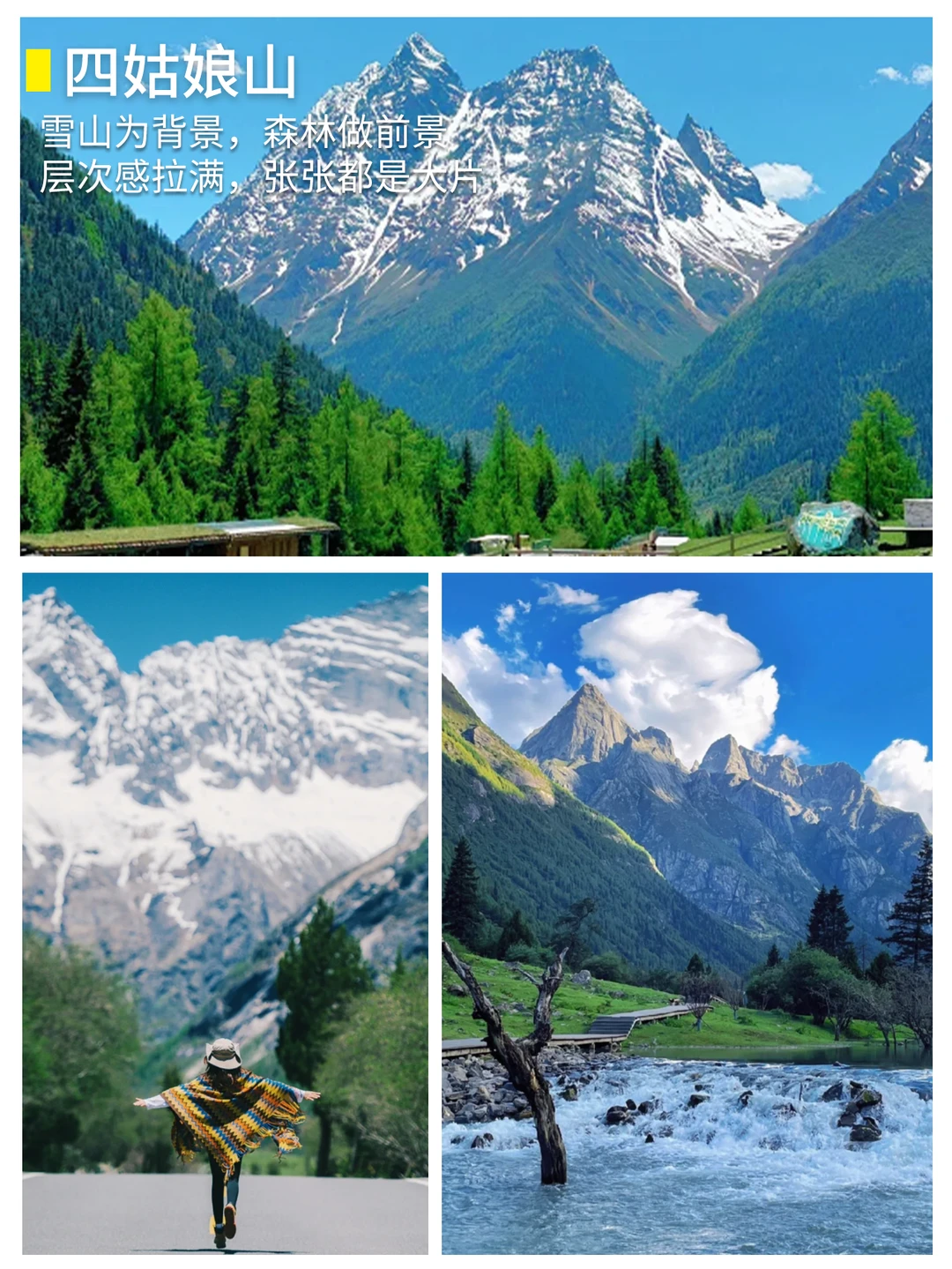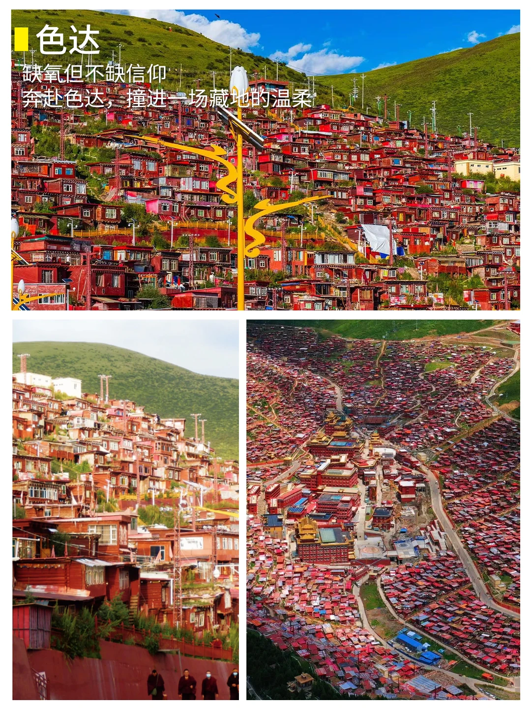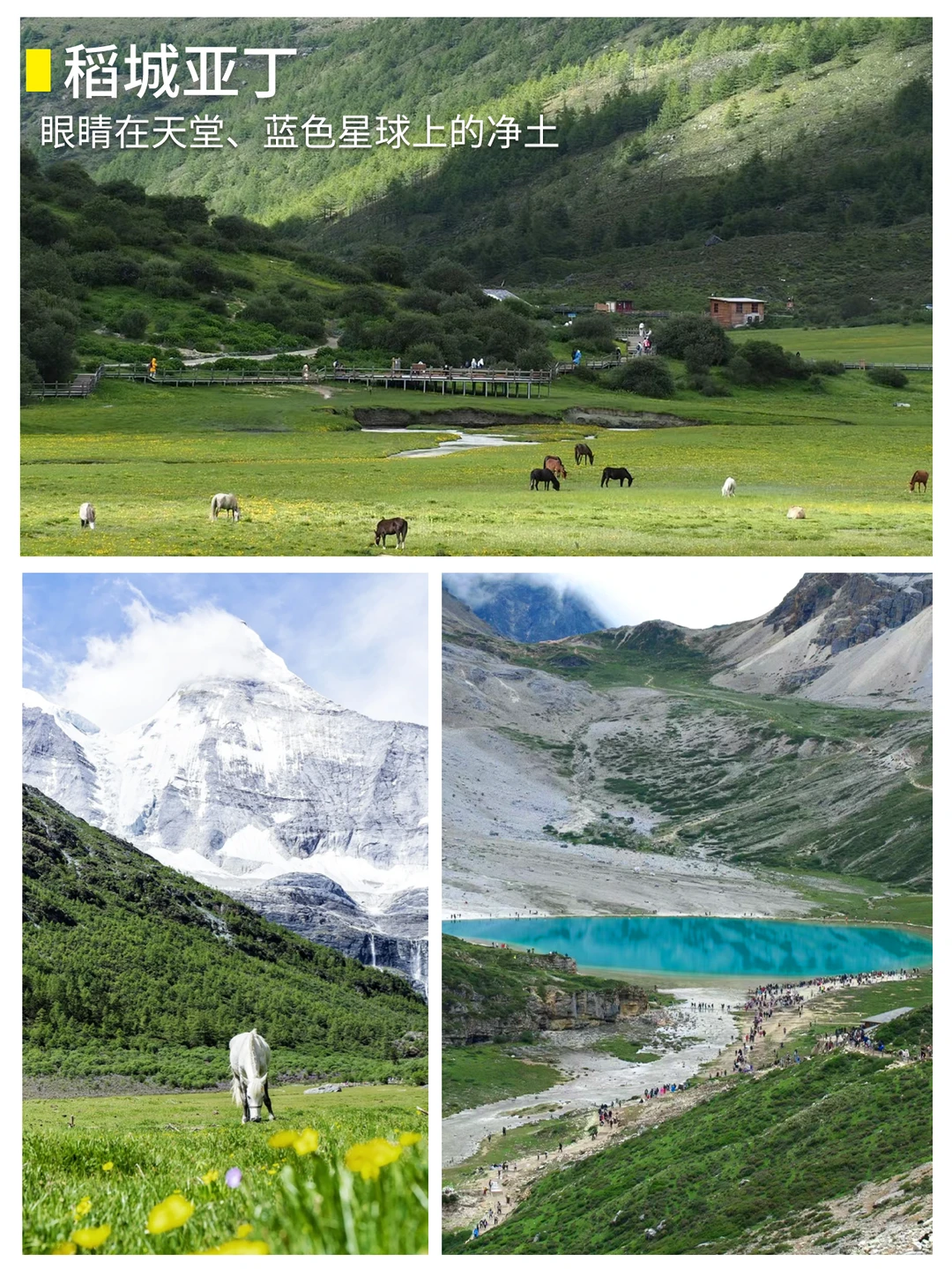 🏞️稻城亚丁把天空揉碎成海子,色达的红屋将虔诚堆叠成山,四姑娘山的雪峰静默成诗。
