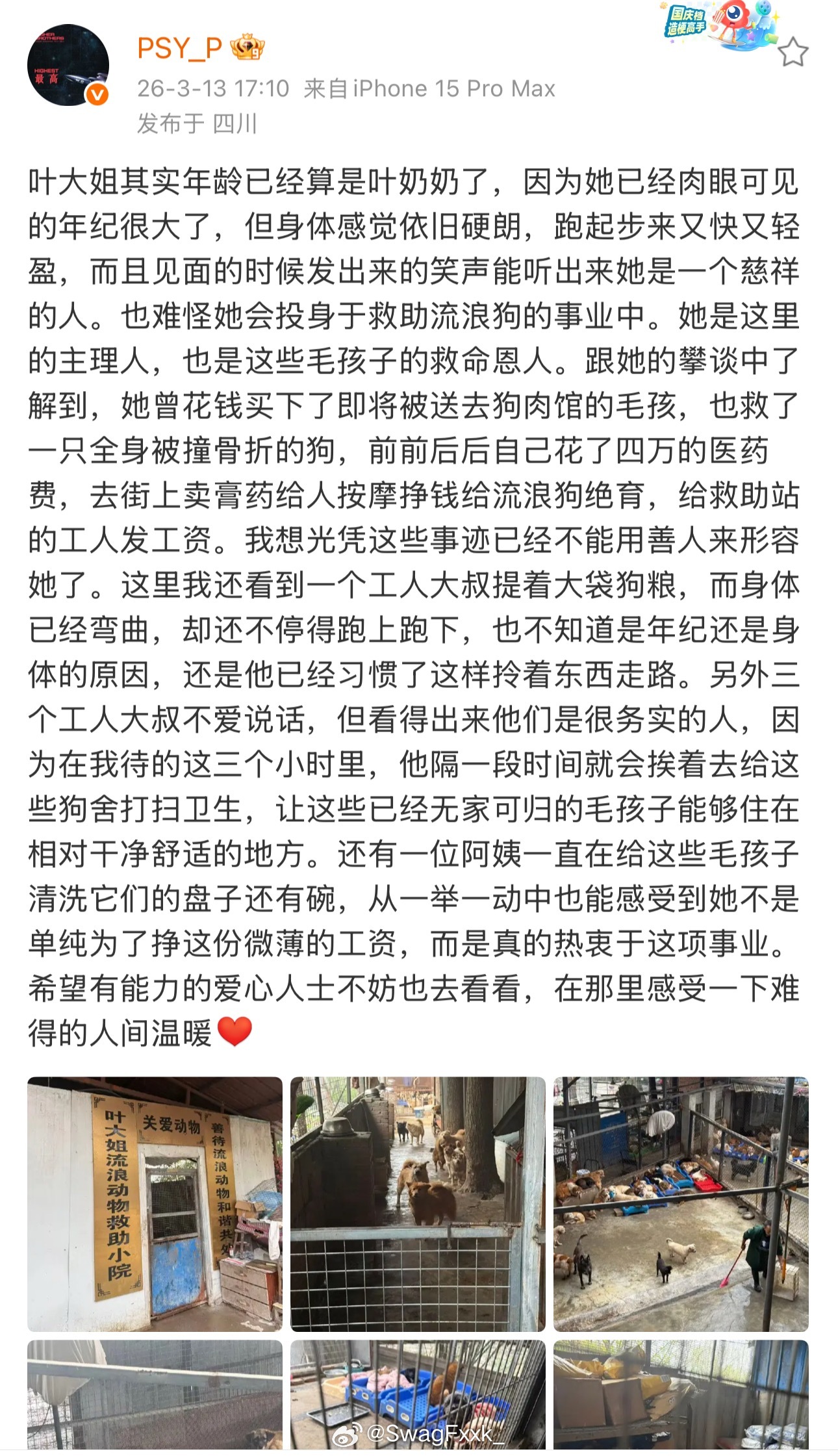 Psy.P发文宣传叶大姐流浪动物救助小院!呼吁有能力的爱心人士不妨也去看看,在那