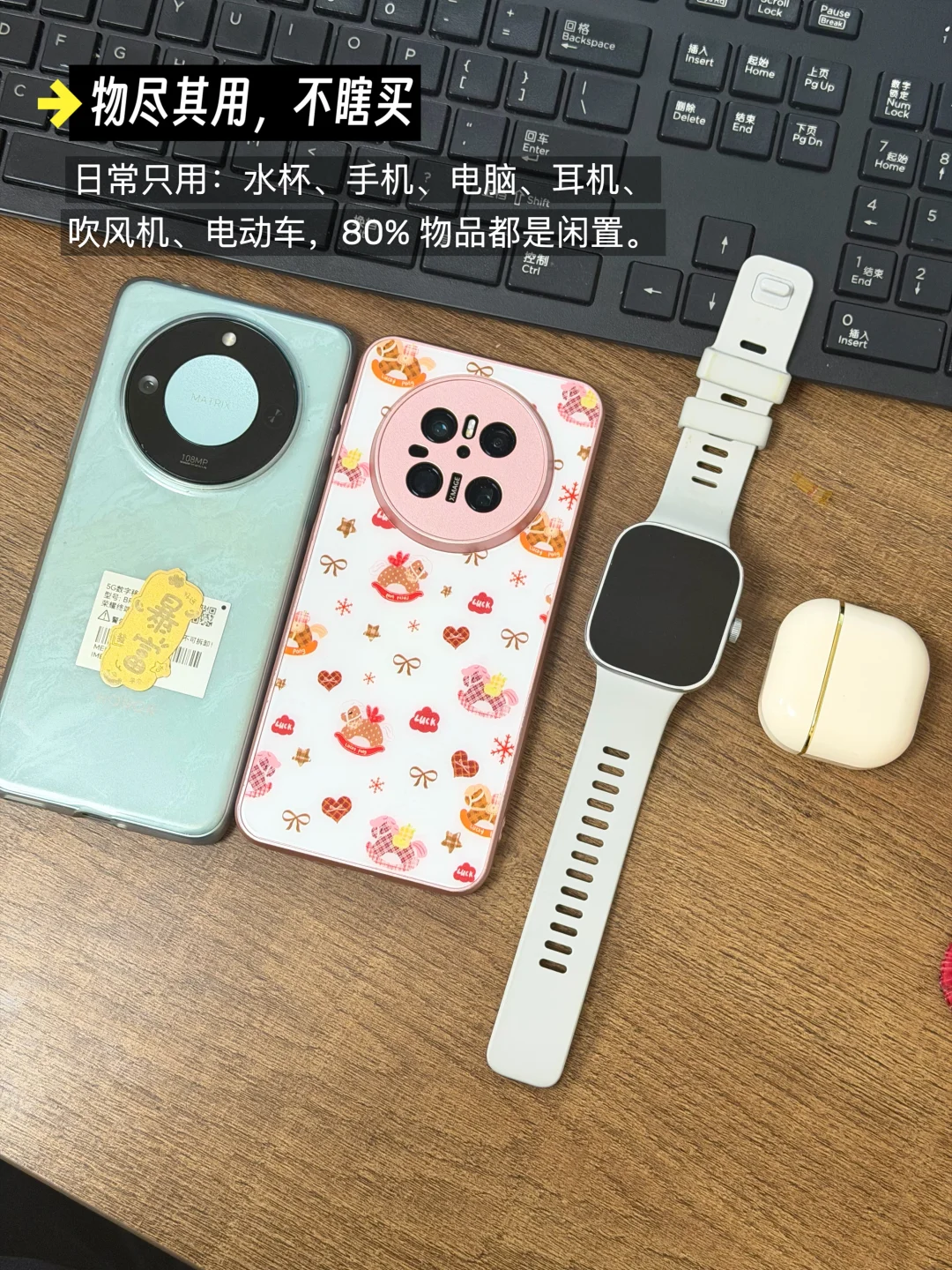 日常只用:水杯、手机、电脑、耳机、吹风机、电动车,80% 物品都是闲置。华为 Mate20 用了 3 年,给妈妈又用 4 年,至今正常使用。东西没坏绝不换,电子产品买耐用款,平摊下来每天也花不了多少钱。