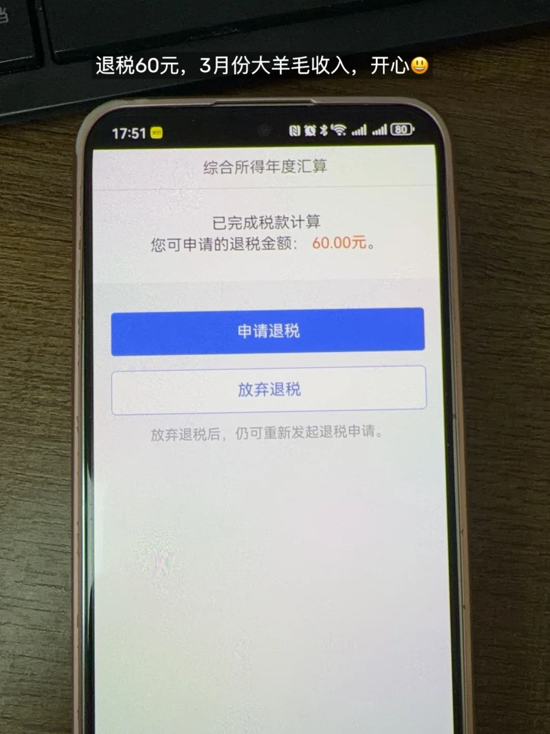 3 月额外收入 60 元,超开心!去年工资不足 5 万,本达不到退税标准,上家公司用我信息申报 1.2 万,直接超 6 万,成功退税 60 元,小羊毛真香。