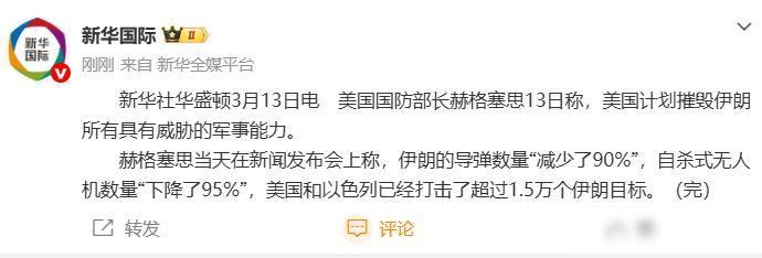 美军说炸了1.5万个伊朗目标,数字精确得吓人,可没人能查证,伊朗自己还照常试导弹 3月13号,美国防部长赫格塞思开了个记者会,提到美军和以色列军队已经打掉超过1.5万个伊朗军事目标,他说伊朗的导弹少了九成,自杀式无人机也只剩百分之五,这话被不少外国媒体直接当新闻报出去了,但问题是这些数字怎么来的,没有公开来源可以查证,联合国没发布过相关消息,连第三方机构都没机会去核实。 这些百分比听起来太整齐了,打仗可不是做数学题,实际评估时很少有人敢报这么准的数字,伊朗去年还在测试“征服者-313”导弹,红海那边也一直有无人机发射点活动,如果损失真有那么大,按照一万五千个目标来算,平均每平方公里打掉十二个设施,这个密度比加沙和乌克兰还高,但美军连清单都没拿出来,更别说说明怎么打的、打成什么样子了。 有意思的是,发言时间卡得很巧,美国国会正在审《中东威慑法案》,以色列也升级了“铁穹”系统,军工股那周涨了8%多,一边报告战果,一边吸引投资,节奏几乎同步,伊朗也没闲着,从2025年起把无人机控制链路换到量子加密节点上,物理设备炸再多,信号照样能绕过去继续飞。 以前有过类似情况,2003年美军打伊拉克的时候,他们说萨达姆销毁了八成的大规模杀伤性武器,后来发现根本不存在这件事,那时候依靠卫星照片和叛逃人员提供的情报,现在人工智能识别目标的错误率仍然有百分之十五到二十五,伊朗现在不依赖单一武器系统,他们采用的是分布式的蜂群战术,把装备伪装成民用物资,还通过盟友之间共享零部件,你炸掉一个工厂,那些零件可能从也门或者沙特那边流进来。 伊朗在技术上有了新变化,他们在波斯湾部署了高频干扰塔,导致美国MQ-9无人机的导航误差升到37%,新的无人机转而使用民用5G频段,雷达系统无法区分快递信号和炸弹信号,所以所谓“摧毁95%无人机”可能只适用于老型号,新型号早就混进城市通信网络溜走了。
