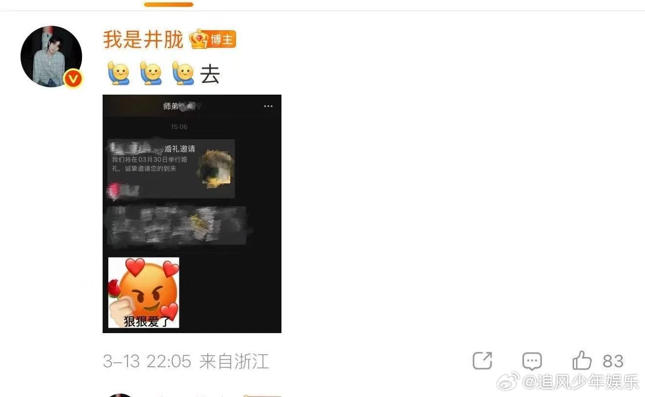 井胧上一秒误闯婚礼下一秒受邀婚礼 网友都被井胧的经历笑不活了,上一秒还在节目里尴尬误入婚礼,下一秒就被喜帖砸中,建议他以后直接常驻婚礼现场,氛围感直接拉满。
