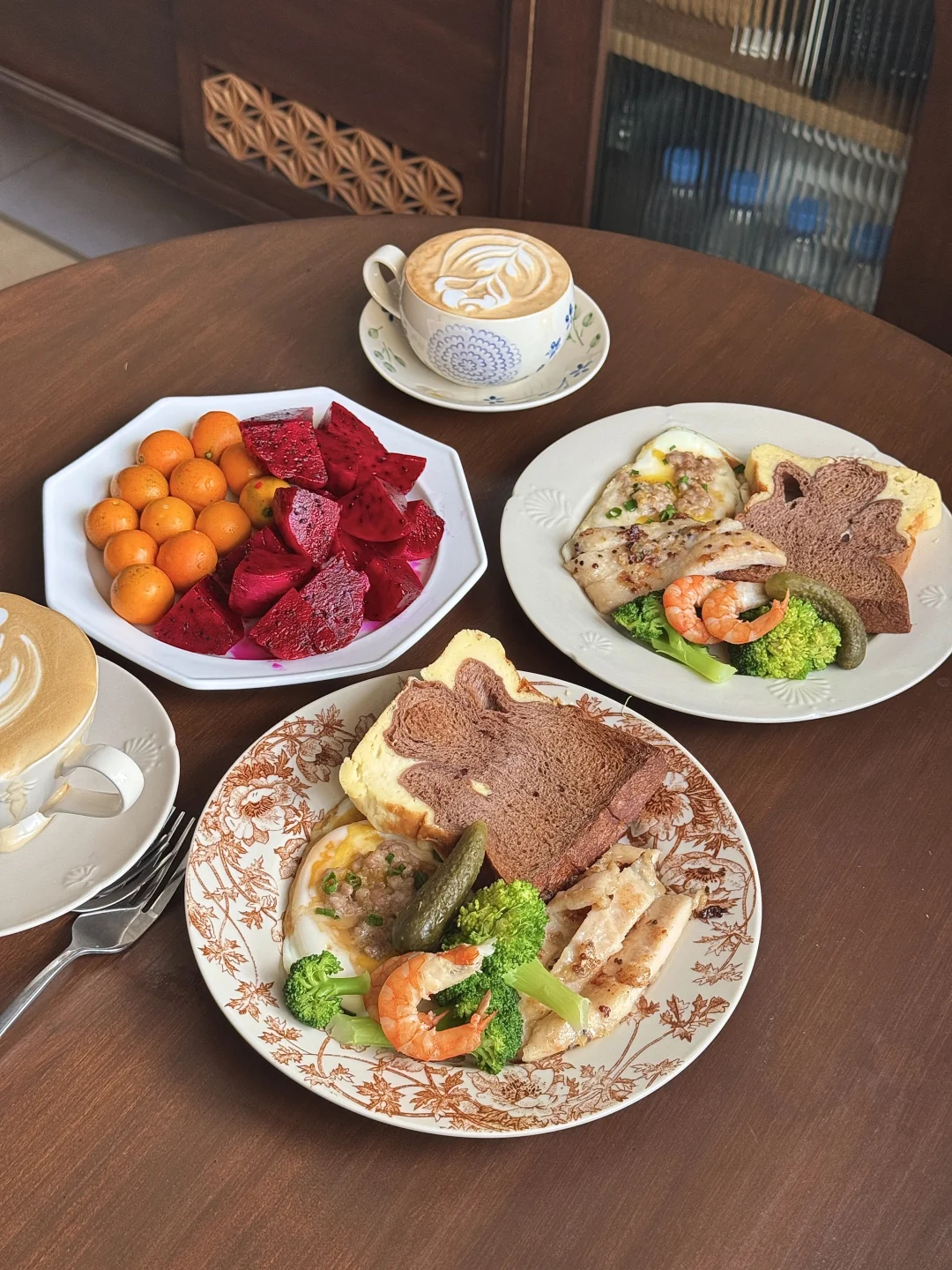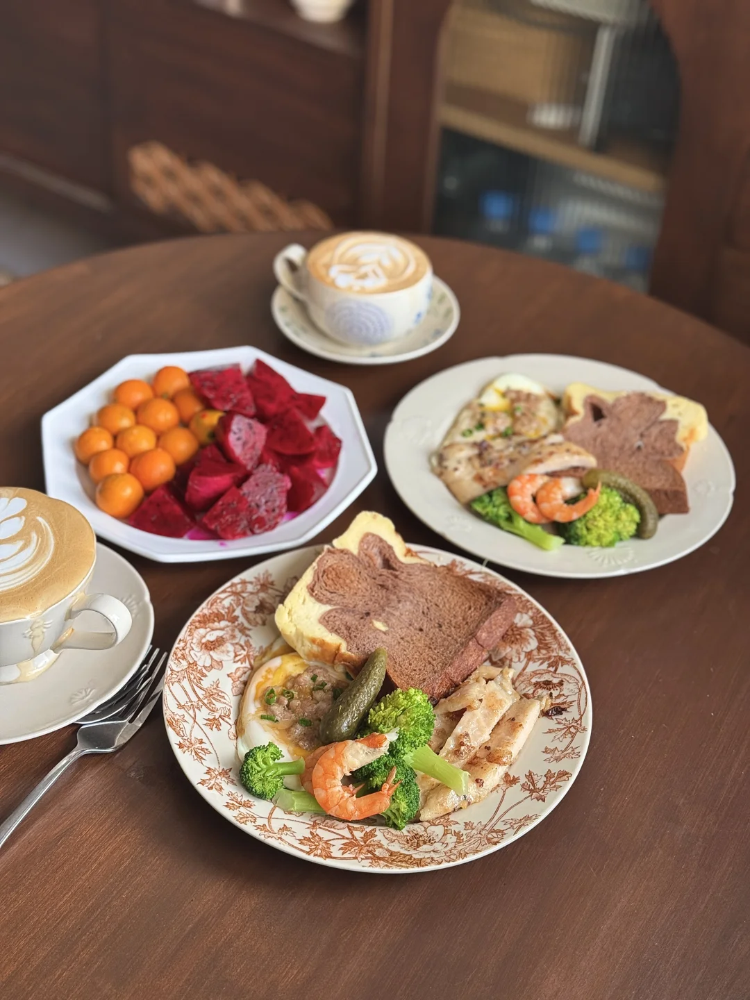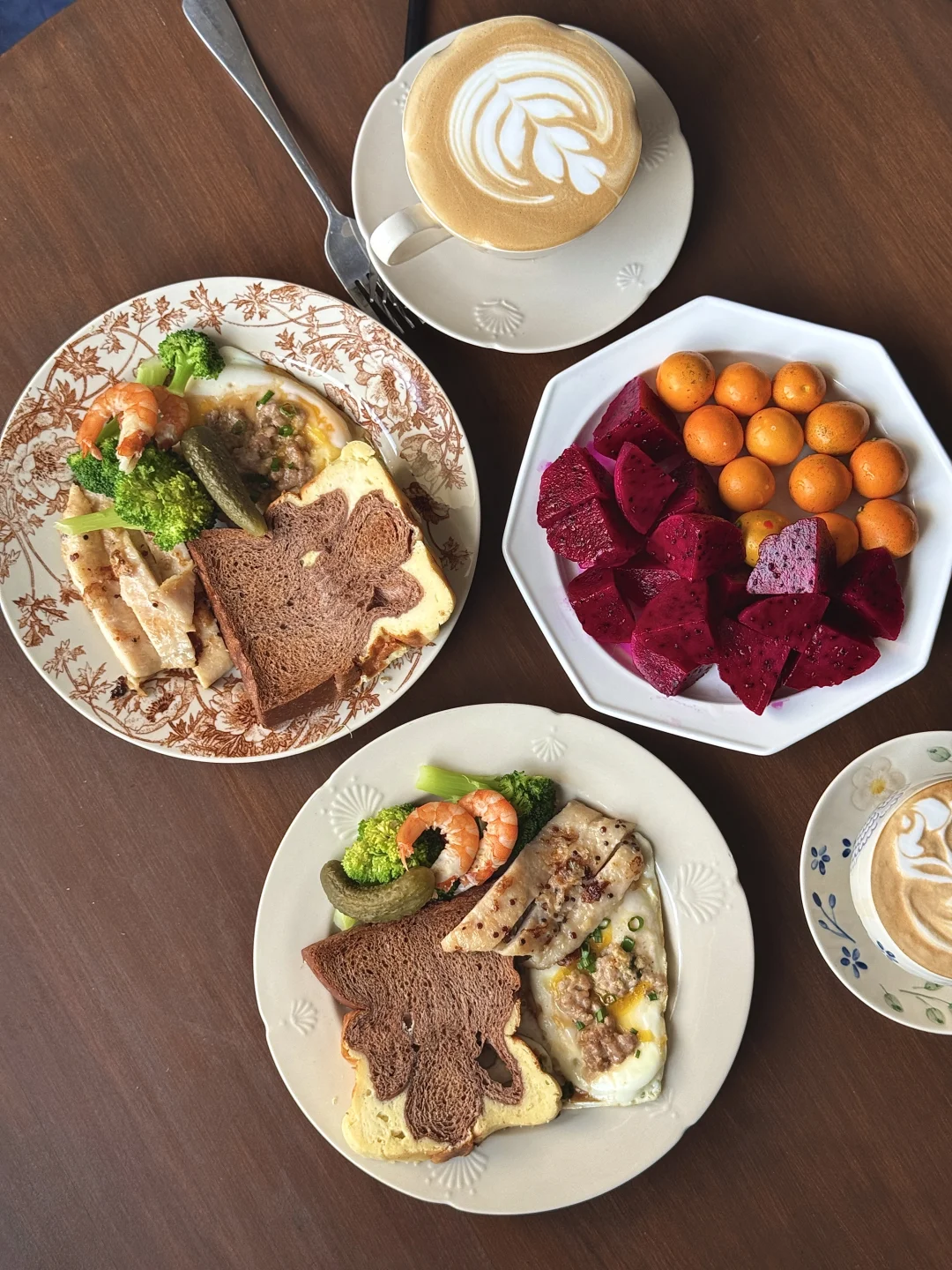 没有复杂的摆盘,只有认真生活的烟火气✨ 两个人的早餐,就是把喜欢的食材都摆上桌~ • 主食:巧克力吐司+鸡蛋料理 (撒了肉末和葱花,流心蛋太治愈!) • 蛋白质:煎鸡胸肉+鲜虾仁,补充满满能量 • 蔬菜:西蓝花+酸黄瓜,清爽解腻 • 水果:红心火龙果+小金桔,酸甜开胃 • 饮品:两杯拉花咖啡,仪式感拉满☕ 在家躺平的日子,慢慢吃, 这就是最踏实的幸福呀~