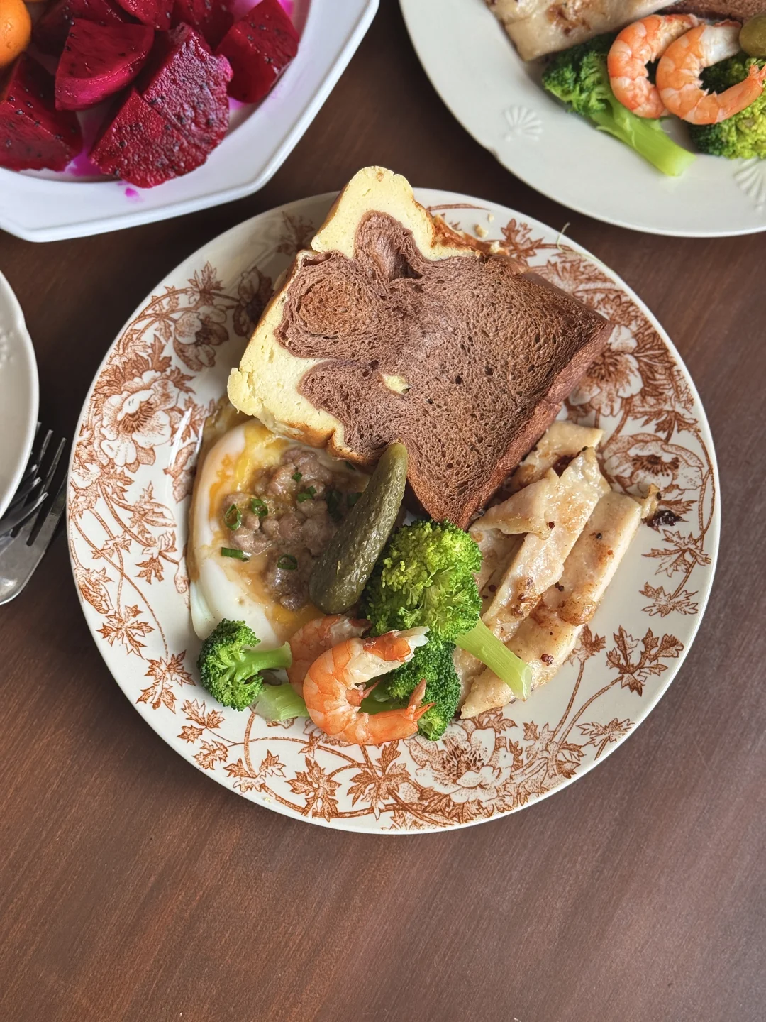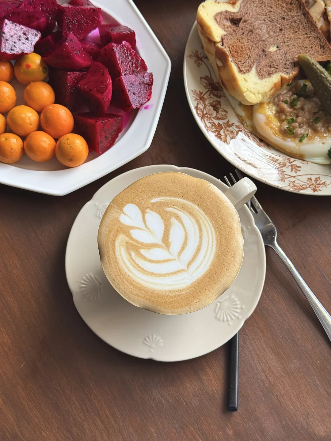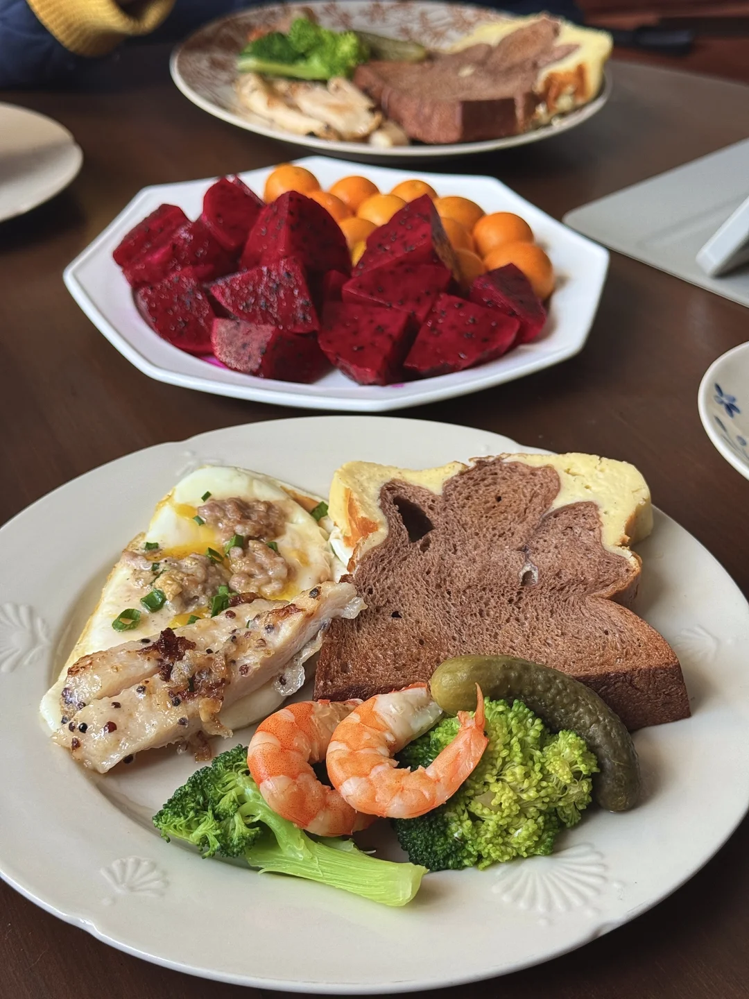 没有复杂的摆盘,只有认真生活的烟火气✨ 两个人的早餐,就是把喜欢的食材都摆上桌~ • 主食:巧克力吐司+鸡蛋料理 (撒了肉末和葱花,流心蛋太治愈!) • 蛋白质:煎鸡胸肉+鲜虾仁,补充满满能量 • 蔬菜:西蓝花+酸黄瓜,清爽解腻 • 水果:红心火龙果+小金桔,酸甜开胃 • 饮品:两杯拉花咖啡,仪式感拉满☕ 在家躺平的日子,慢慢吃, 这就是最踏实的幸福呀~