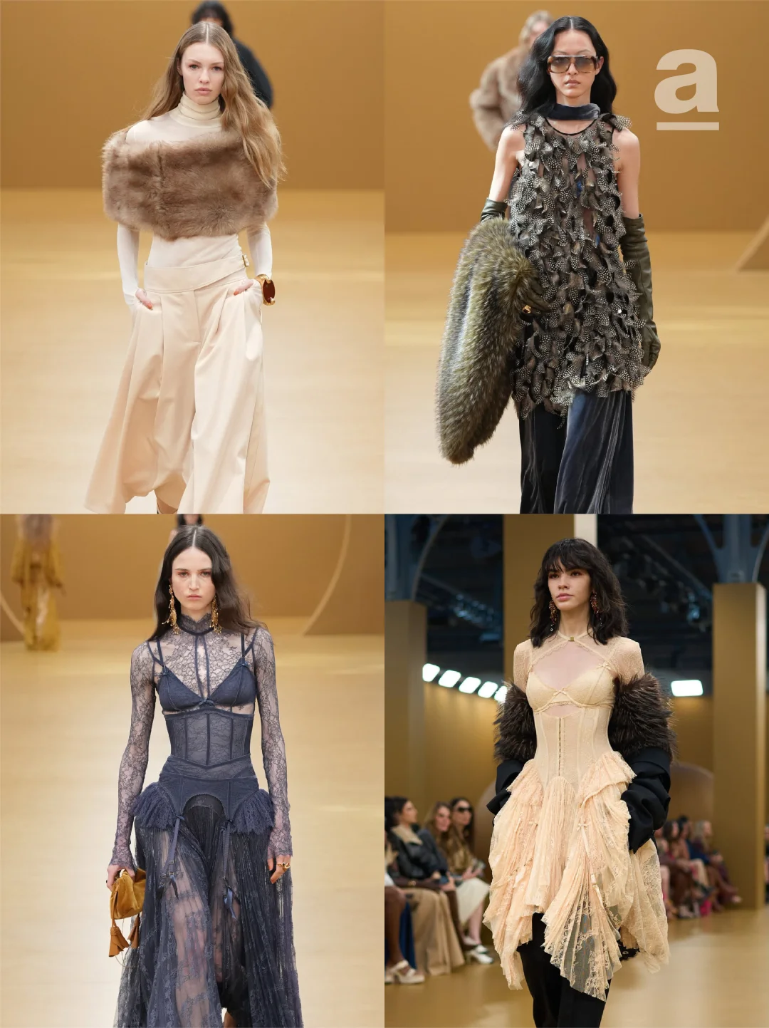 3️⃣精致细节:蕾丝、刺绣、手工钉珠、抽褶、绑带、透视拼接。