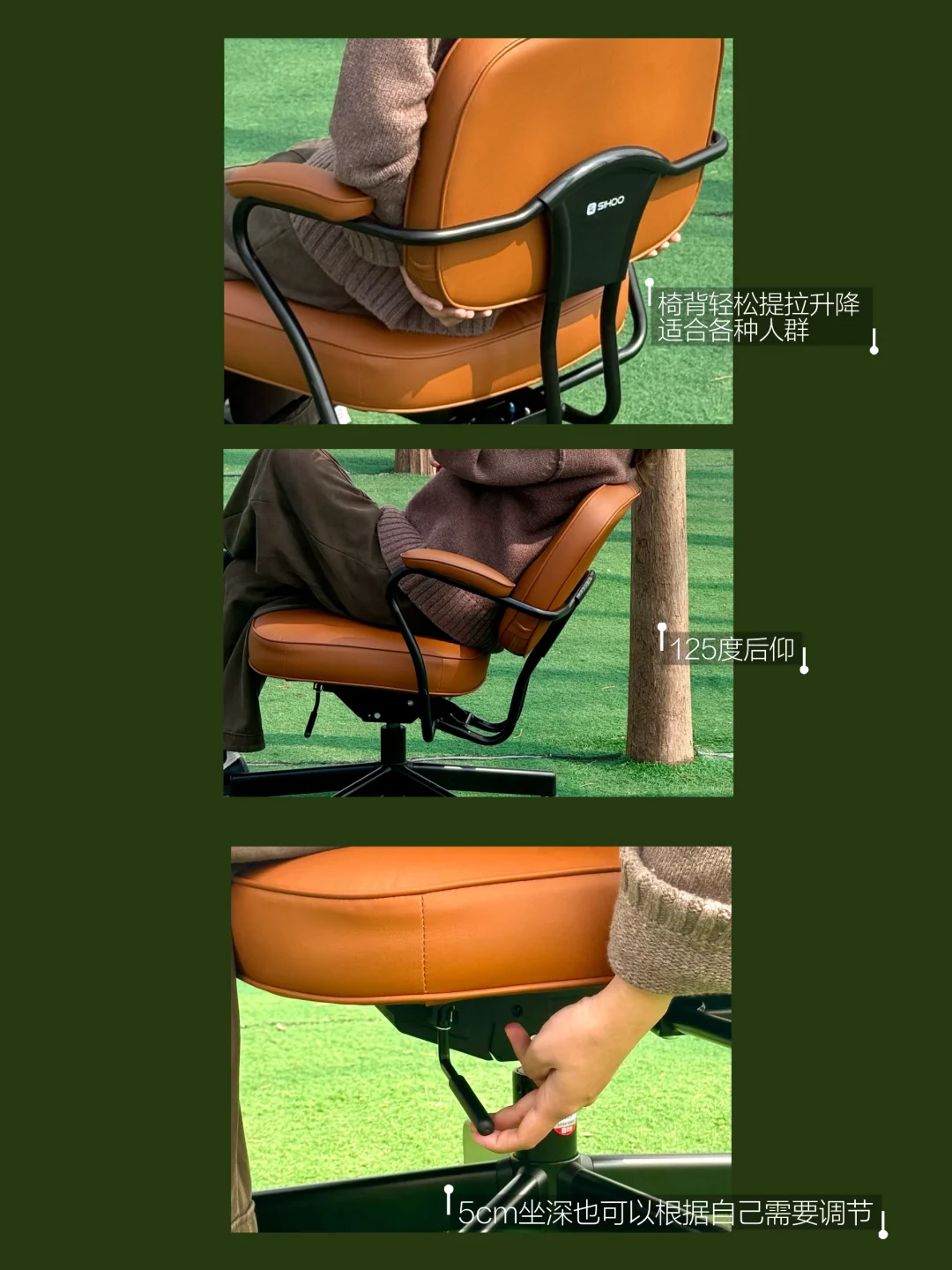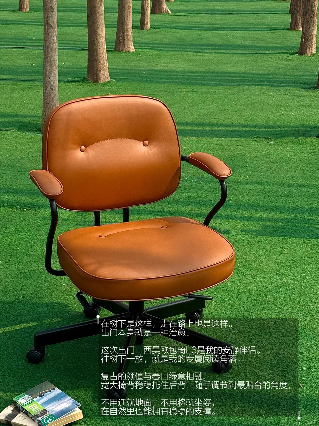 复古的棕色皮质与春日绿意相融,坐下那一刻,椅背和坐垫的双弧线就轻轻贴合了我的身体——椅背有弧,像自带靠枕,刚好托住腰,坐垫有弧,承托臀部压力,久坐也觉得自在。