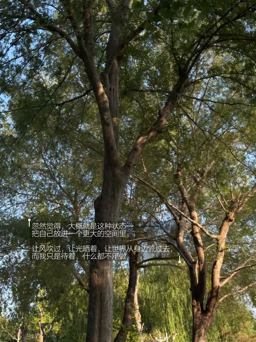 忽然觉得,大概就是这种状态—把自己放进一个更大的空间里,让风吹过,让光晒着,让世界从身边流过去,而我只是待着,什么都不用做。