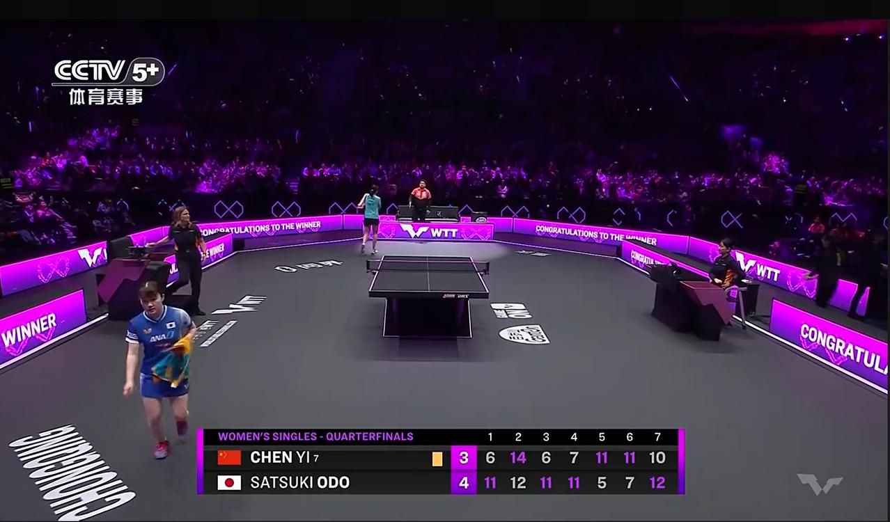 重庆冠军赛,陈熠大战大藤沙月,3-4失利,个人感觉,陈熠还是嫩了点!输得可惜,但也不冤枉。 前两局陈熠对大藤沙月的急长发球有点不适应,回球质量不高,对方猛烈进攻时,显得比较被动,甚至被一板拉死,从第三局开始,陈熠在对拉、相持逐渐落于下风,大藤显得相当强势,正手爆冲、反手爆拧像跳舞一般,拍拍都是结结实实的,陈熠对拉一旦角度不够大,就打不穿对方,率先失误的大概率都是自己,后面基本都是追分,鲜有领先的情况,局数1-3落后,战局已经岌岌可危!这说明陈熠经验还是不够,变化不多,都是和对方拼对攻,但冲击力明显不足,力量落点都压不住人家,比赛中多次看到陈熠被大藤反手大力扣杀直接挡飞的情形。 第五局大藤肩膀拉伤请求医疗暂停,也不知是不是大藤的伤势影响了她的发挥,我感觉她的状态有点断崖式下降,陈熠追回一局,第六局也连续得分,从7-2到8-5、9-6,到11-7拿下。决胜局陈熠坚决打反手斜线,从0-5落后追到8-8平,10-10后,陈熠反手失误,连丢2分而失利。 陈熠基本功比以前更扎实了,但打球还是缺了那么一点灵气,比如第六局和决胜局一度摸到了获胜的钥匙,那就是要把大藤打退台!通过远台的大角度打崩她,但陈熠似乎没能意识到这一点,依然被大藤在中近台持续进攻,自己又显得急躁,从她决胜局的表情,感觉到她有点疲惫,压力也太大了,想赢,又打不到位,知道输了比赛,心理都在这两端拉扯。 陈熠现在还是有一些瓶颈需要突破,比如节奏变化、关键分的把控,火候还没够!好好总结吧,按目前的情况,她要战胜张本美和等第一梯队选手,还是有点难,但不管怎么说,道路是曲折的,前途是光明的,加油吧!