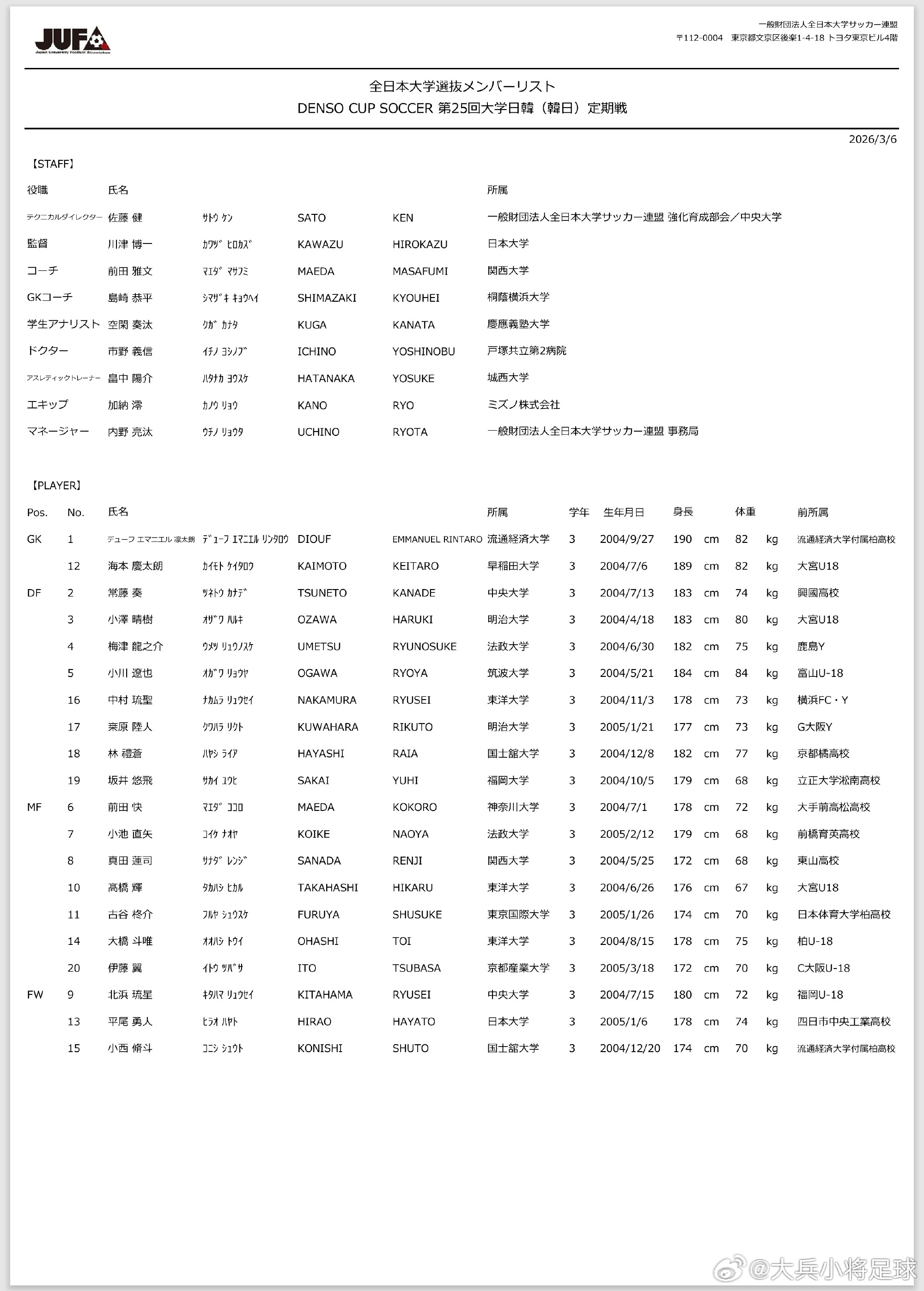 比赛时间:北京时间3月15日12:00KO比赛地点:ウェーブスタジアム(Wave Stadium)刈谷(〒448-0011 愛知県刈谷市築地町荒田1)对阵对手:全日本大学選抜 2-1全韩国大学選抜直播频道: 全日本大学足球連盟公式YOUTUBE官方频道:JUFA_Japan(免费)⚽️得点者:45+2分 平尾 勇人57分 失点66分 小川 遼也