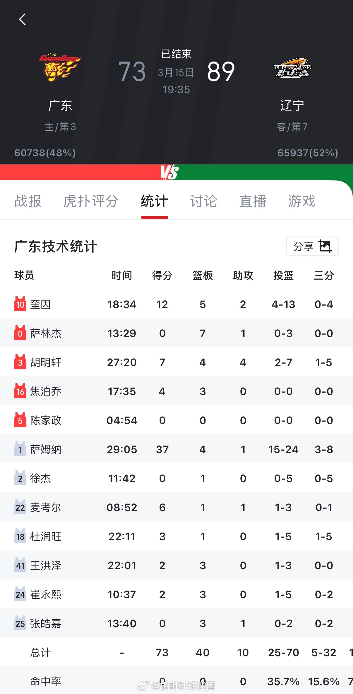 胡明轩广东男篮vs辽宁男篮 🏀CBA联赛25-26赛季常规赛第26轮⛹️ 全场比赛结束 广东东阳光 73 🆚 89 辽宁本钢数据方面:🐯胡明轩7分4篮板4助攻1抢断