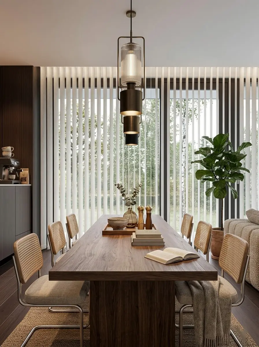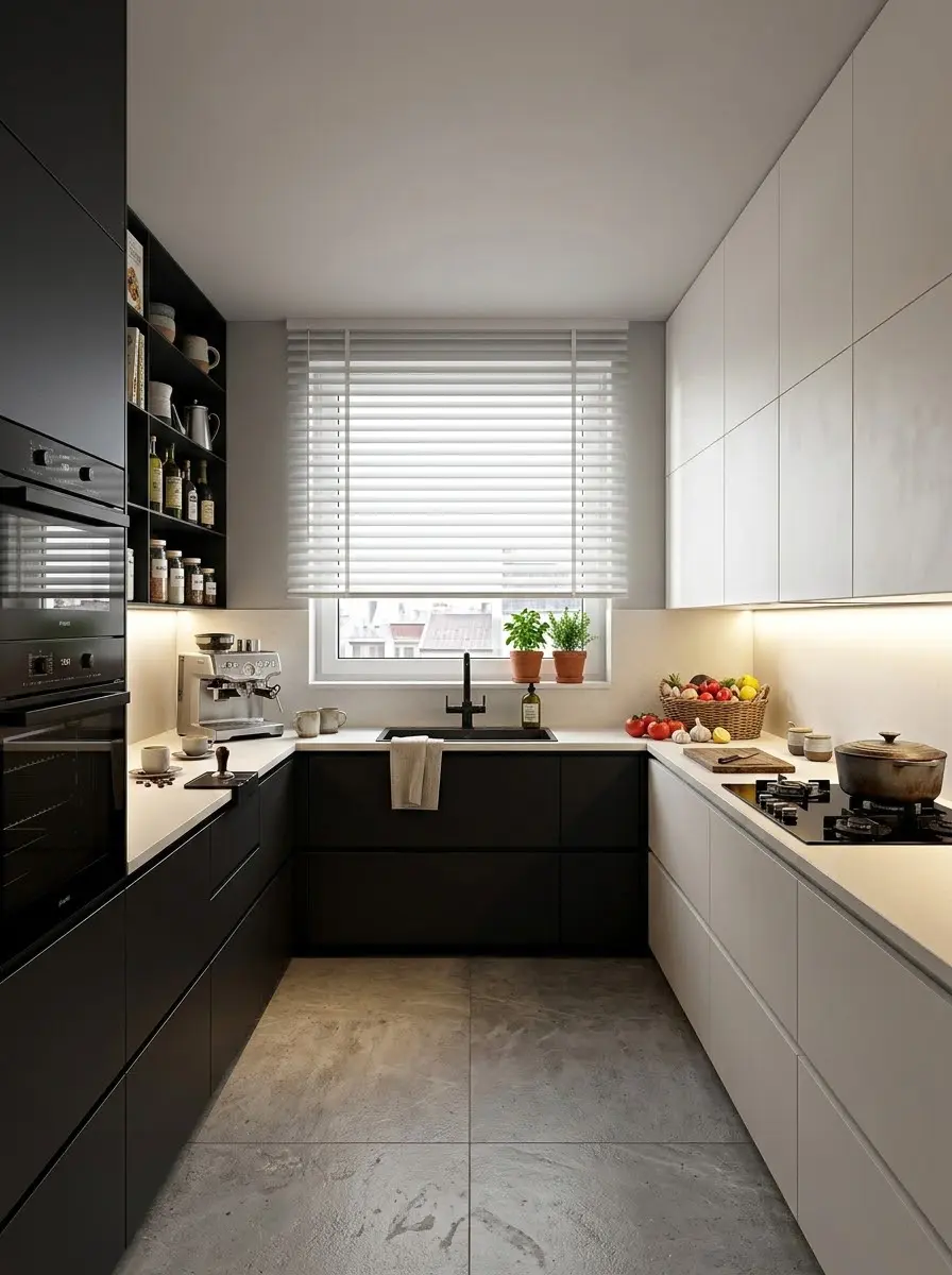 私属定制: 步入式衣帽间与生活起居区完美动静分区。哑光黑橱柜与原木餐桌的碰撞,让烟火气也拥有了艺术展厅般的视觉享受。