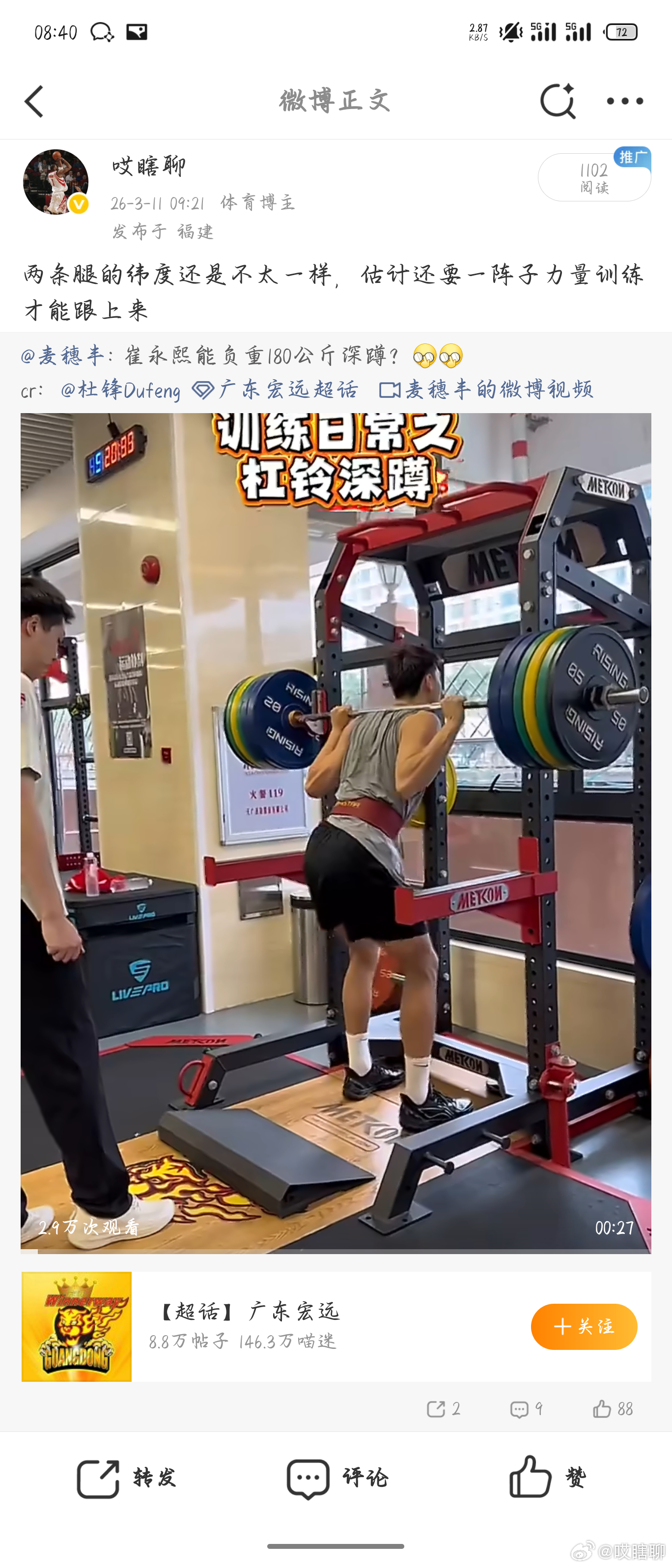 辽宁男篮战胜广东男篮关于崔永熙的恢复情况,我之前就有指出,很明显他两条腿的腿围明显还不一样,下肢力量训练还没跟上来,昨天的比赛也能看出来,整体的身体能力还不适应,这赛季先给崔永熙一点时间恢复和适应吧崔永熙