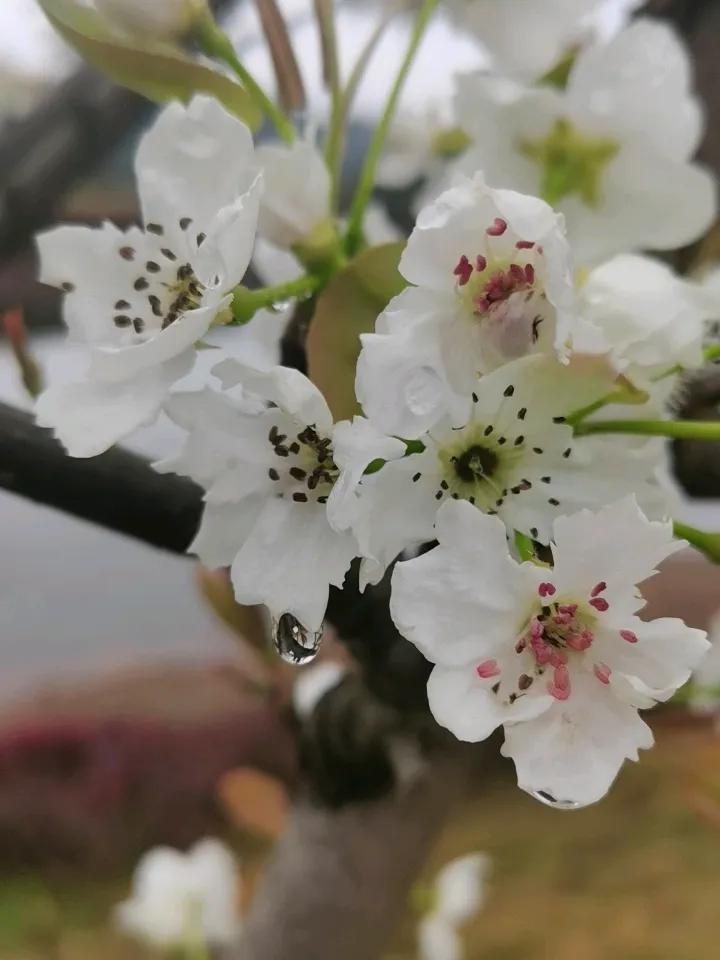 一场春雨之后,梨树坪梨花又开了。由于连续下雨,早上的空气有点润,微风过处,发梢、
