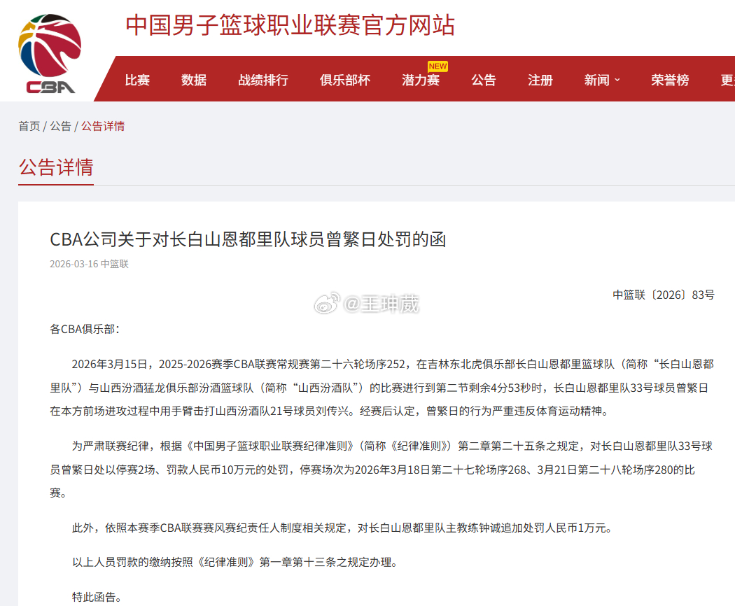 曾繁日恶犯遭停赛两场罚款10万 曾繁日在昨天的比赛中右手重拳击打刘传兴,后者当场痛苦倒地,裁判通过回看当即将曾繁日夺权。CBA官方开出罚单,吉林男篮球员曾繁日因恶劣动作被罚款10万元,停赛2场,吉林队主帅钟诚被罚1万元。cba